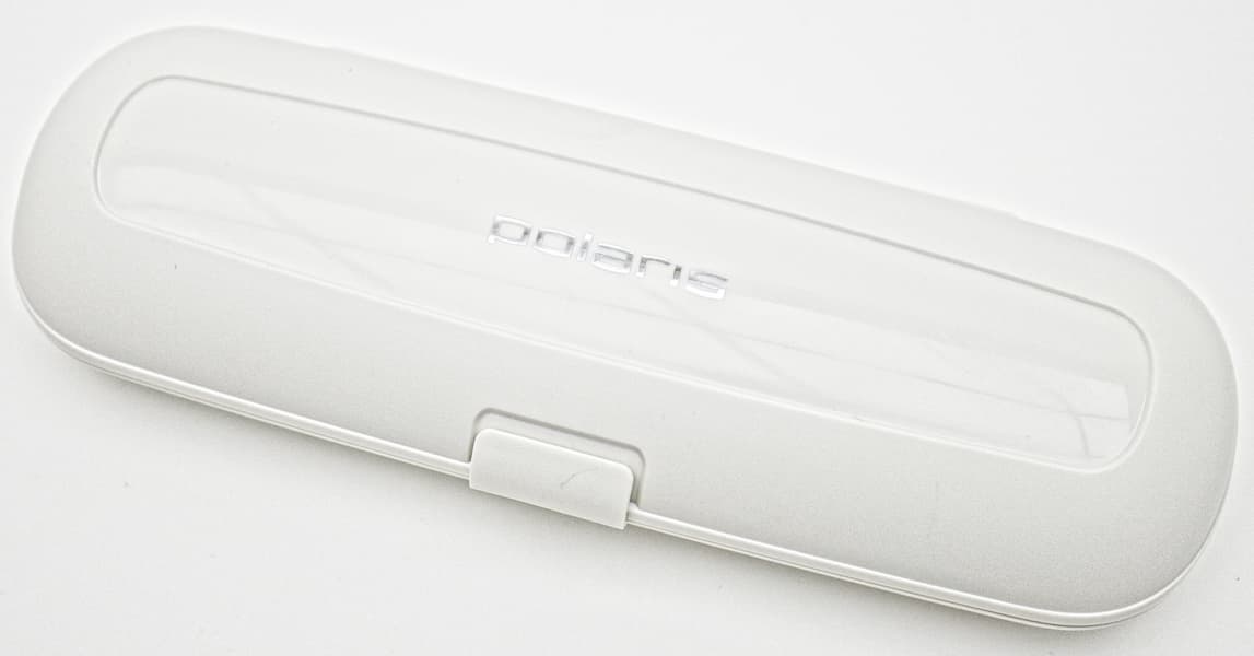 Футляр из белого матового пластика — в основном, слегка шершавого. Идеальной гладкостью и блеском отличается только картуш с логотипом фирмы на крышке. Пространство внутри разделено перегородками-держалками и размечено выпуклыми рисунками, которые подсказывают, как разместить корпус щетки и насадки. Зарядное устройство внутрь уже не помещается.