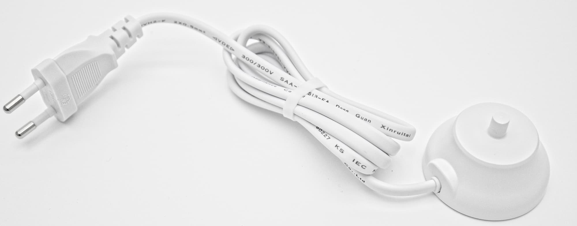 Из боковой поверхности устройства выходит шнур питания, а на дне нанесены сведения о его технических характеристиках (отдельно от щетки) и производителе.