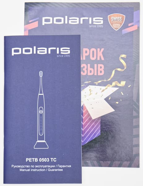 Руководство по эксплуатации модели PETB 0503 TC — это миниатюрная брошюрка в темно-синей матовой обложке с белым силуэтом зубной щетки. Несмотря на то, что название документа — на русском и английском языке, внутри мы обнаружили разделы на русском, украинском и казахском.