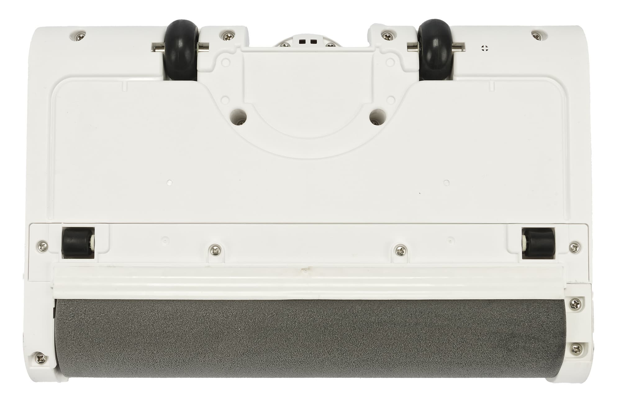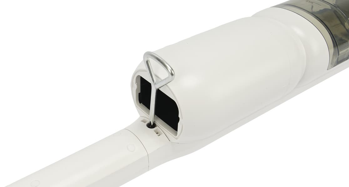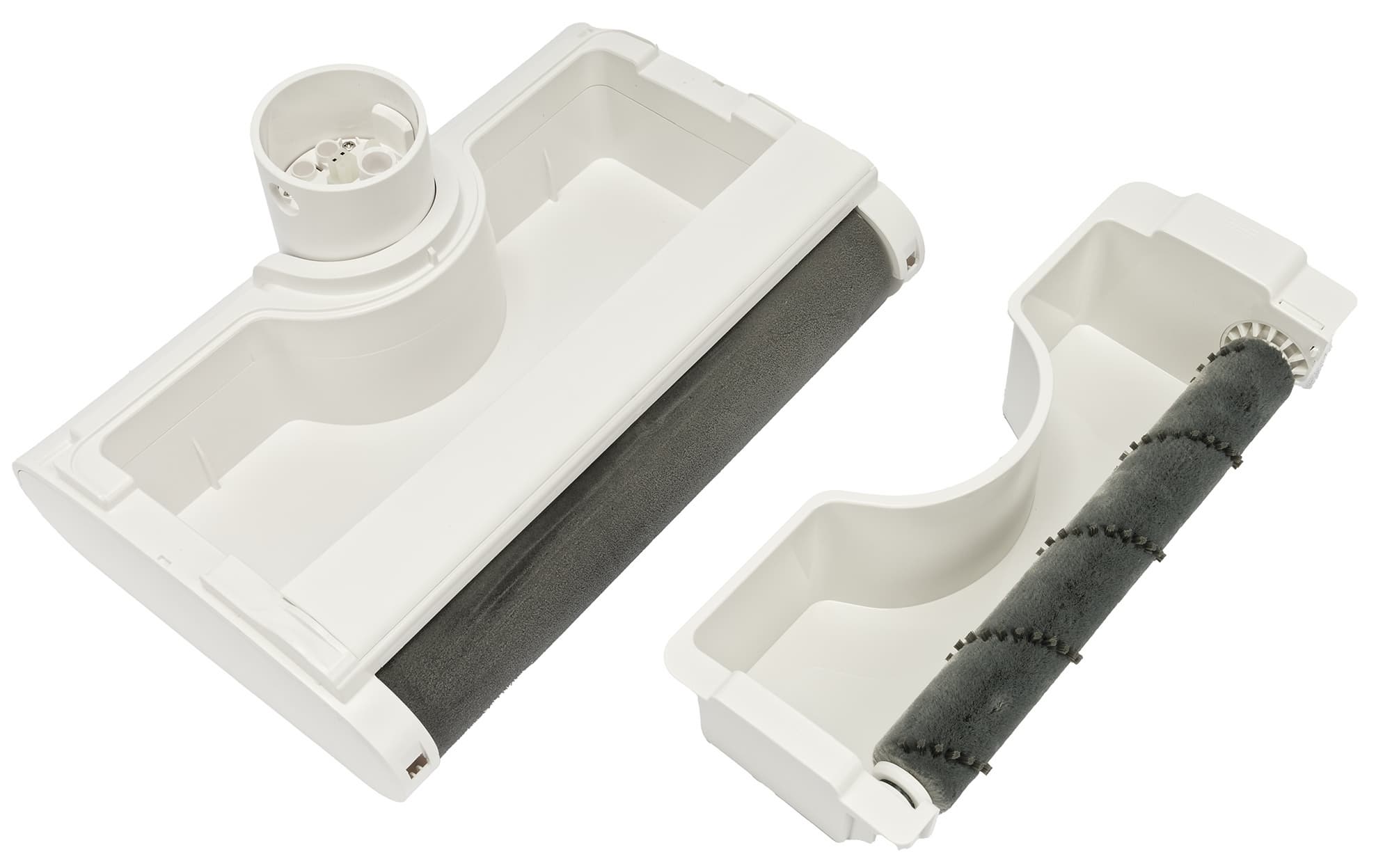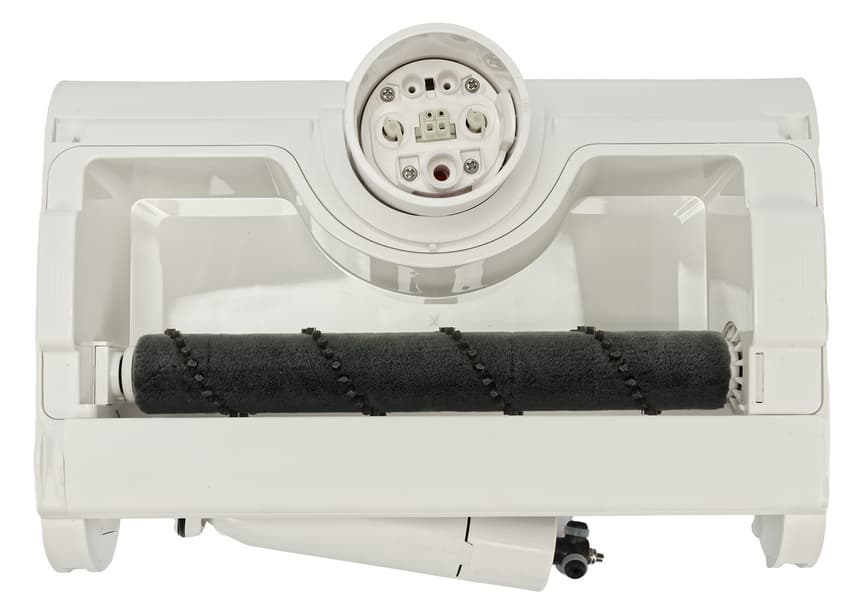 Отсоединив основу швабры от напольной насадки и сняв верхнюю панель можно рассмотреть разъем, пазы для фиксации базового блока и контактную деталь системы подачи воды, а также съемный контейнер для сбора пыли и мусора — именно в него будет попадать мусор с поверхности валика.
