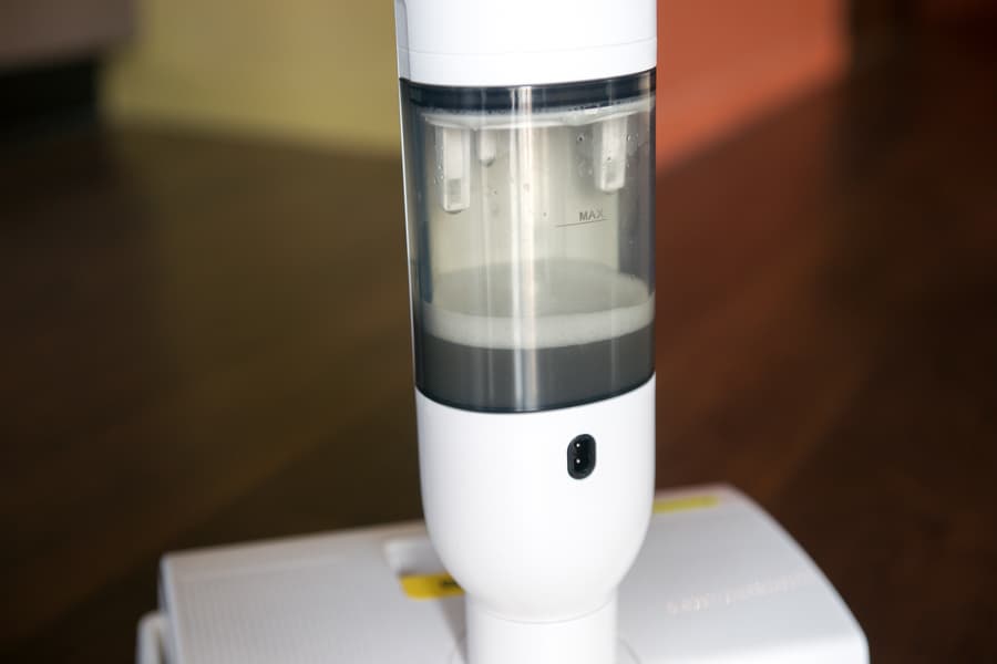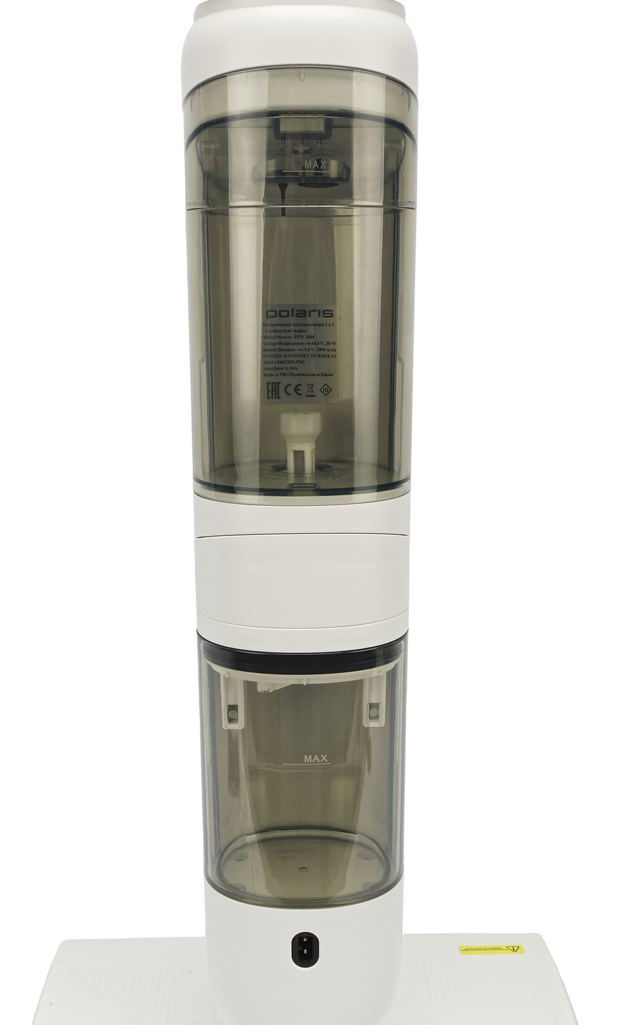 Уровень воды отлично виден сквозь прозрачные стенки емкости, а если она полностью закончилась в процессе уборки прибор остановится и оповестит о необходимости пополнить резервуар звуковым сигналом и загоревшимся индикатором. То же произойдет в случае если контейнер с грязной водой окажется переполненным. Бачок с грязной водой не заполняется после одной уборки. По нашим наблюдениям, его хватает на две уборки и одну-две очистки валика.