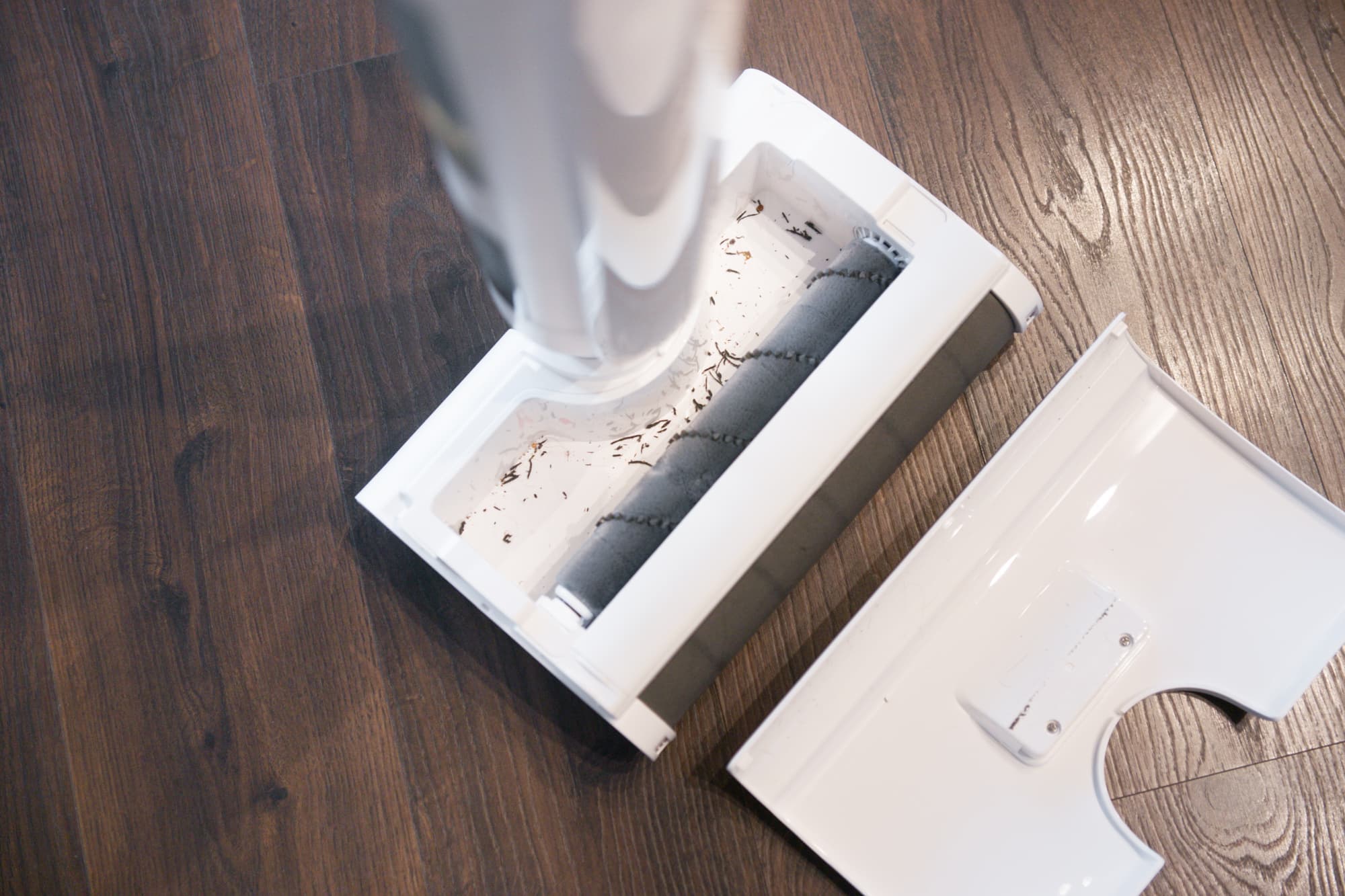 Автоматическая очистка валика эффективна, но она не справляется с избавлением от грязи настолько же идеально, как ручное мытье. Поэтому после каждой тестовой уборки мы снимали валик и мыли его с мылом под проточной водой. Затем отжимали и помещали для просушки в специальное гнездо на базе. Также, через каждые одну-две уборки следует извлекать ворсовой валик и промывать его под краном с мылом.