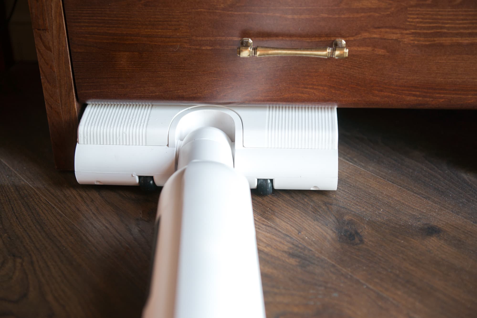 Швабра маневренна, напольная насадка поворачивается под углом по горизонтали, ручка позволяет обработать полы под невысокой мебелью. Для успешного прохождения швабры под мебелью расстояние должно быть не менее 9 см, как на фото ниже.