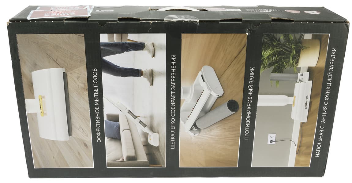 Беспроводная электрошвабра поступила к нам на тестирование в крупной картонной коробке с удобной ручкой. Упаковка массивная, но не очень тяжелая и переносить ее не трудно. На лицевой стороне размещены крупная фотография устройства, логотип компании, наименование модели и краткая информация о ее особенностях. С обратной стороны можно увидеть изображения швабры в действии. Сведения на боковых гранях помогут составить полное представление о конструкции прибора, а также ознакомиться с краткими техническими характеристиками.