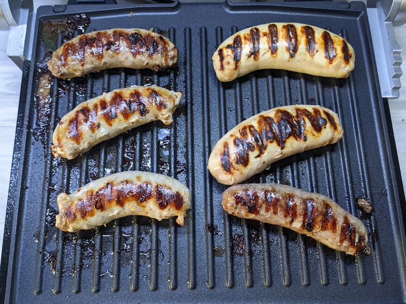 Колбаски, согласно инструкции, нужно готовить на средней температуре, переворачивая каждые четыре минуты (всего их нужно перевернуть четыре раза). В нашем распоряжении оказались говяжьи и куриные колбаски. Посмотрим, как они приготовятся в таком режиме.