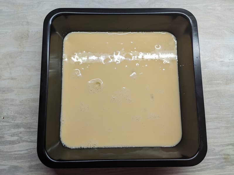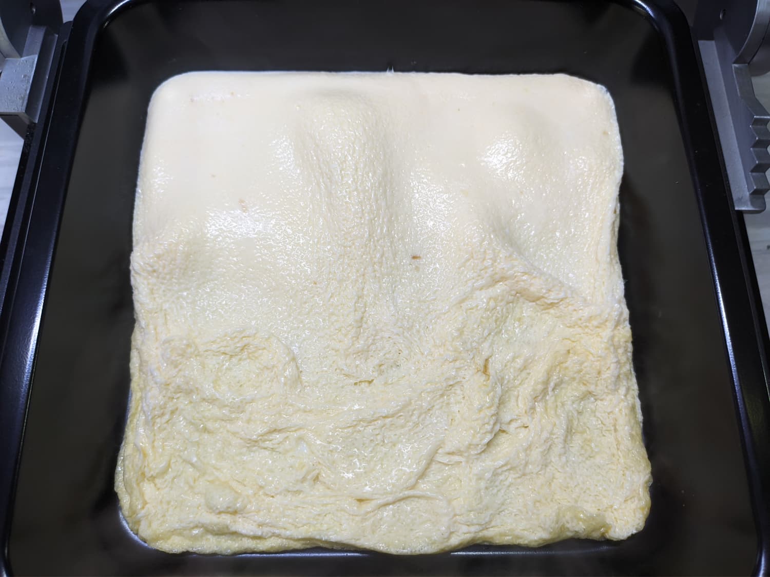 Второй эксперимент с формой — приготовление омлета. Мы взяли три яйца, добавили соответствующий им объем молока, слегка взбили смесь, перелили ее в форму, накрыли фольгой и поставили в гриль, разогретый до минимальной температуры.