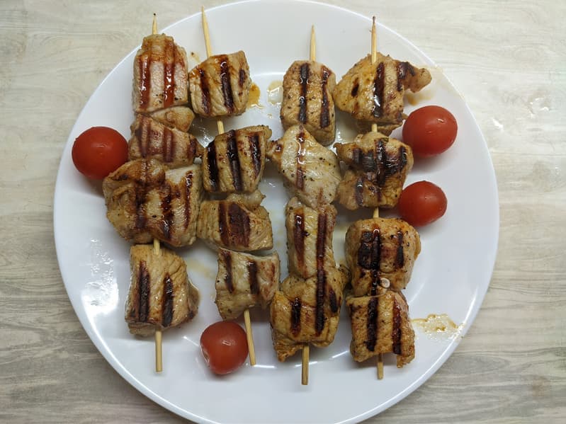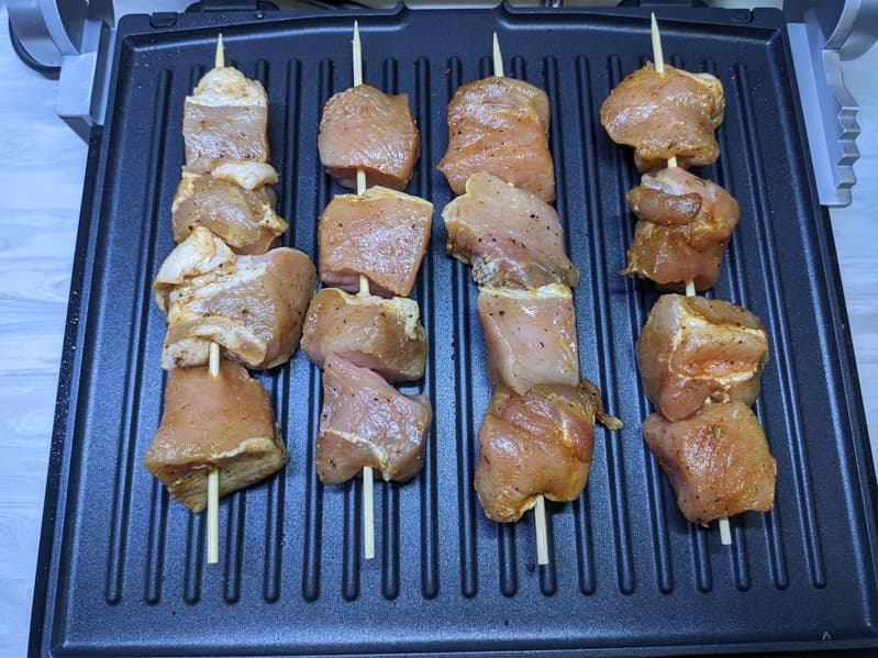 Затем мясо нужно нанизать на деревянные шпажки и жарить 4 минуты при температуре 180 °C.