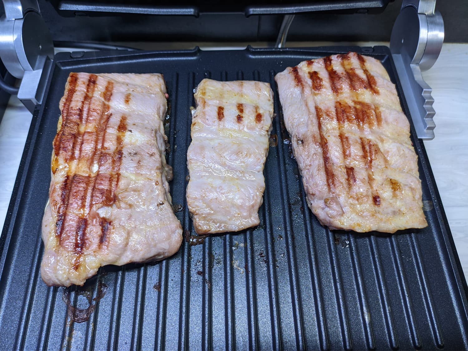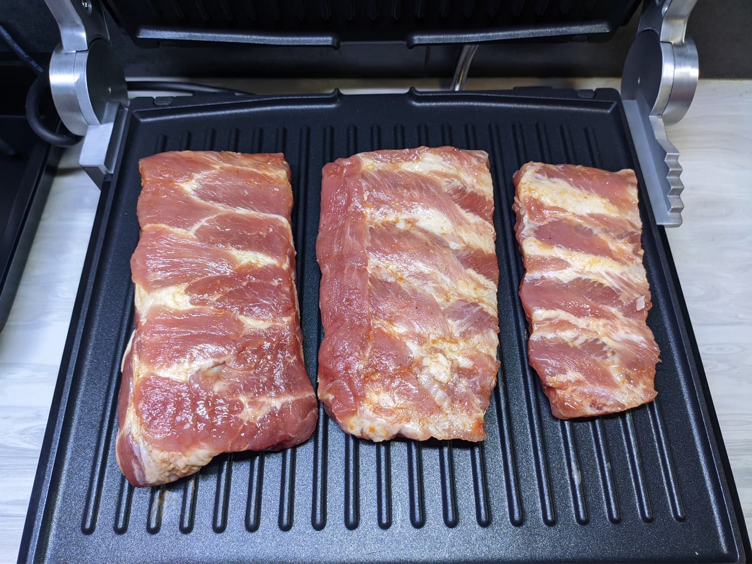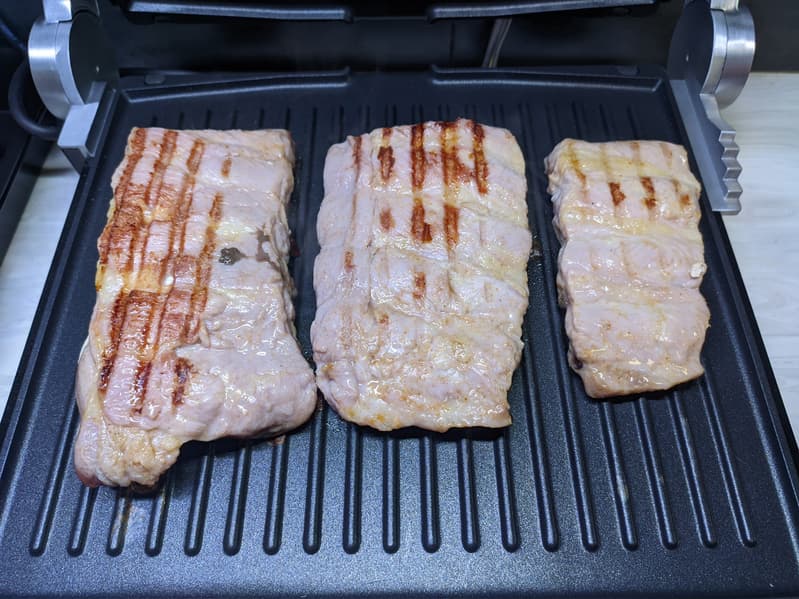 Следующий тест — свиные ребра. Прилагаемая книга рецептов рекомендует мариновать ребра в течение 30 минут в смеси соуса терияки, сладкой паприки, соли и черного молотого перца, после чего готовить 5 минут при температуре 180 °C.