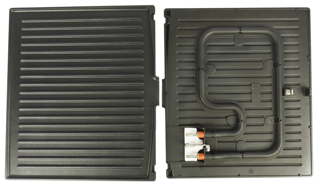 Встроенный нагревательный элемент закреплен на панелях надежно, крепления выглядят аккуратно. Такое решение позволяет более точно контролировать нагрев панелей и обеспечивают более равномерный нагрев (по сравнению с нагревательными элементами, встроенными в корпус гриля).