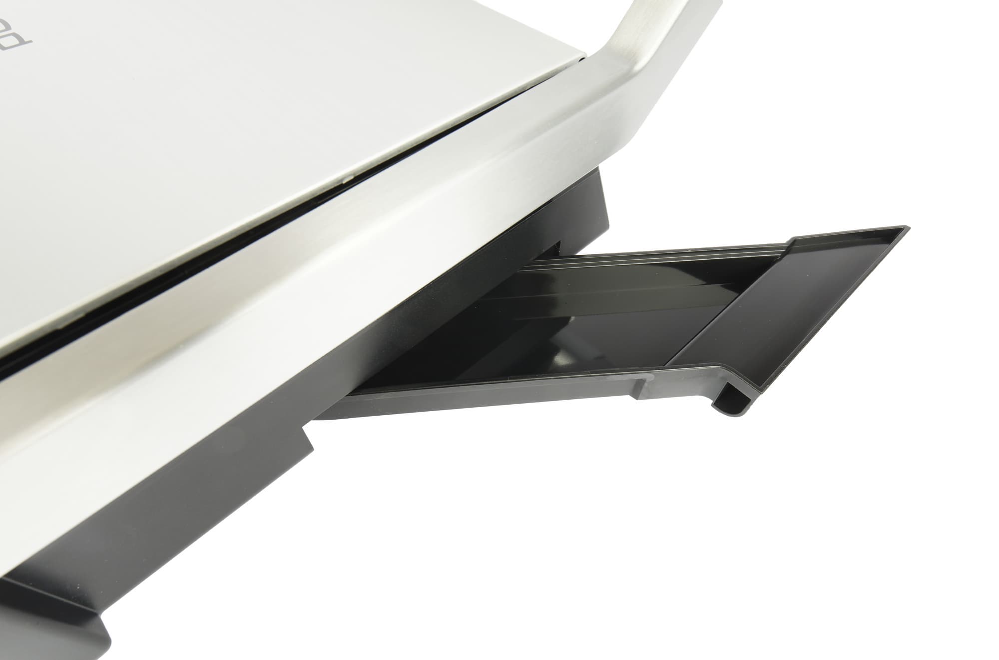 Сбоку располагается выдвигающийся по диагонали съемный лоток для жира. Такое решение также является более удобным, чем лоток, выдвигающийся сзади.