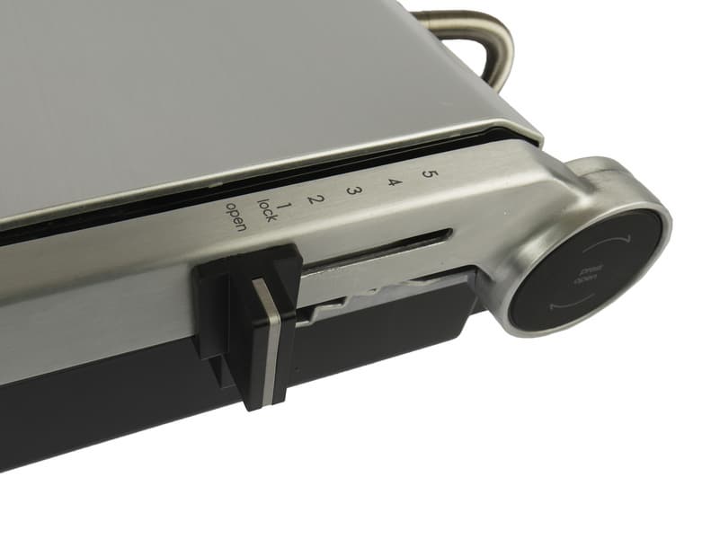 Круглая кнопка, расположенная в основании ручки, позволяет раскрыть панели в режиме барбекю (на 180°). В полностью разложенном виде ручка служит опорой для верхней панели.