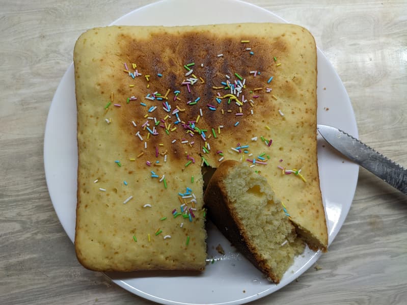 Результат оказался весьма неплох. Несмотря на то, что дальний край явно пропекся чуть лучше, кекс оказался полностью готовым и пропеченным. Без сырых участков теста и без подгоревших корочек.