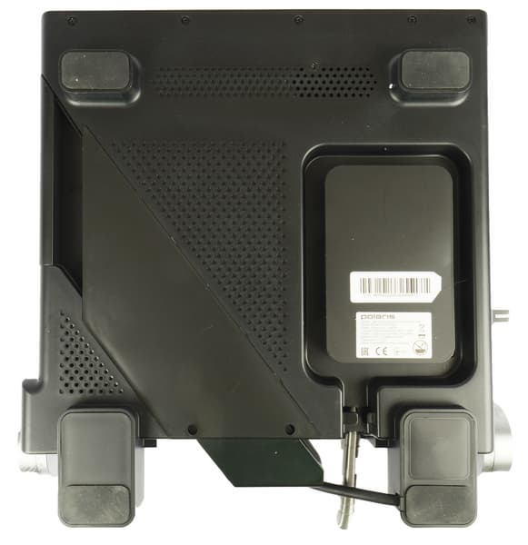 На дне гриля находятся вентиляционные отверстия, четыре ножки с противоскользящими накладками, отсек для хранения излишков шнура и наклейка с технической информацией.