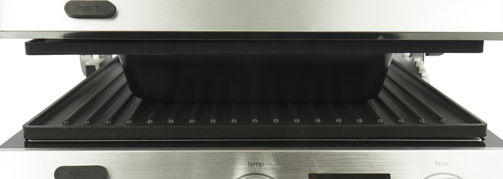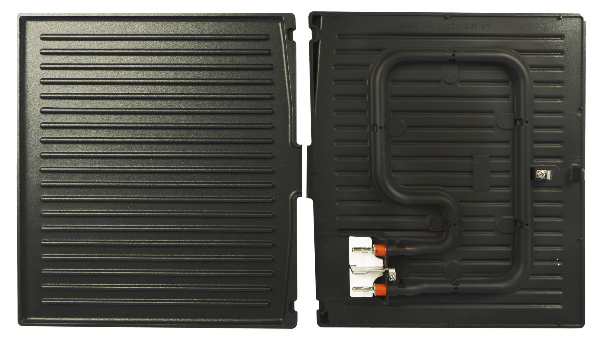 Рифленые рабочие панели со встроенным нагревательным элементом выполнены из металла с антипригарным покрытием. Покрытие производит впечатление прочного, нанесено равномерно. Верхняя и нижняя панели идентичны и взаимозаменяемы: любую из них можно установить на крышку или корпус гриля. Панели фиксируются зажимом и снимаются при нажатии на выступающие из корпуса черные кнопки с надписью Eject. Размер панели — 29×25,5 см.