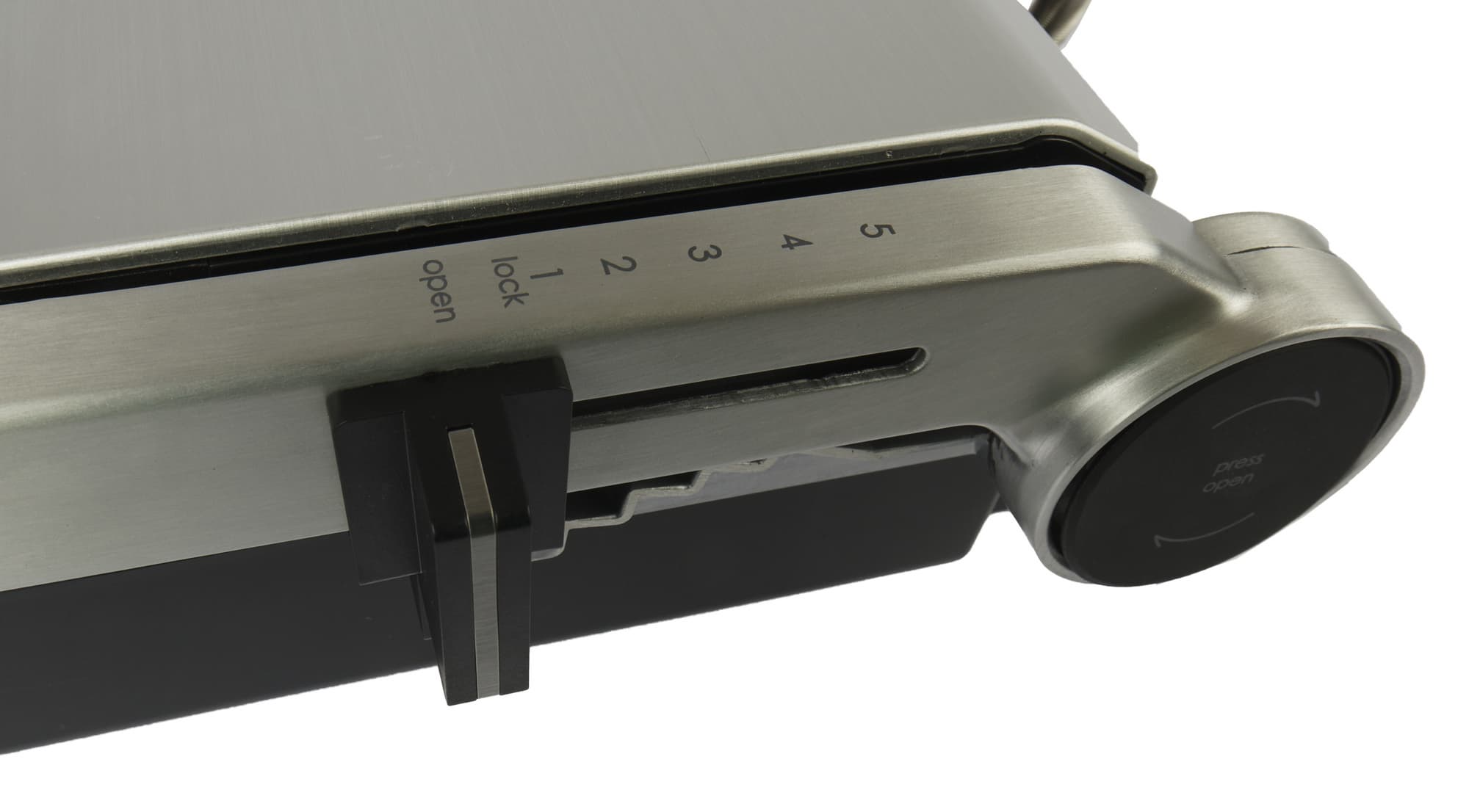 При помощи фиксатора можно установить один из 5 вариантов расстояния между панелями. Open — положение в котором крышка раскрывается до 90° и при закрытии плотно ложится на нижнюю панель, придавливая продукты сверху.