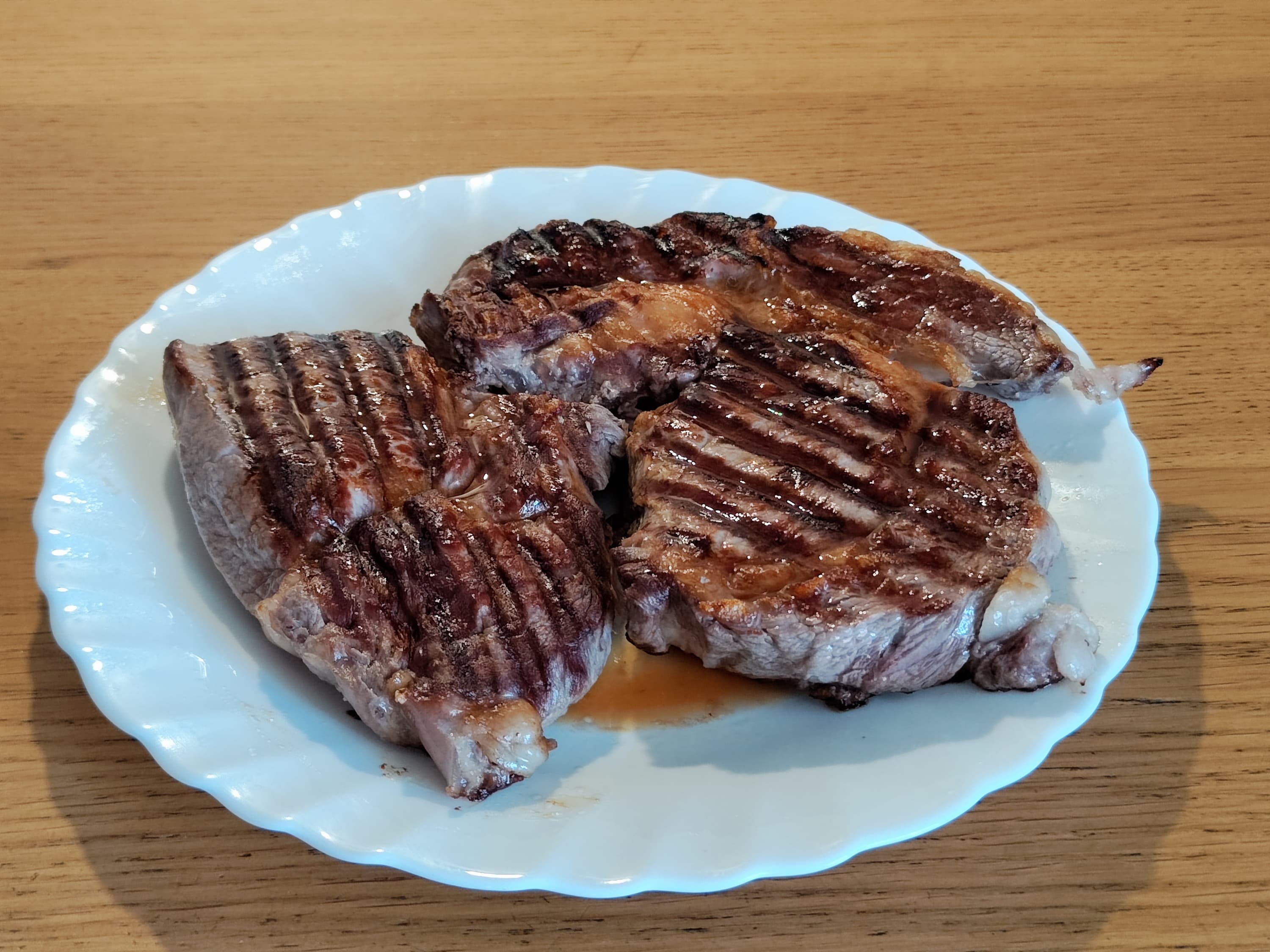 Стейк был неравномерен по толщине, поэтому в одном куске встречались почти все степени прожарки от rare до medium well, но это проблема не гриля, а качества исходного сырья. К работе прибора нет никаких замечаний.