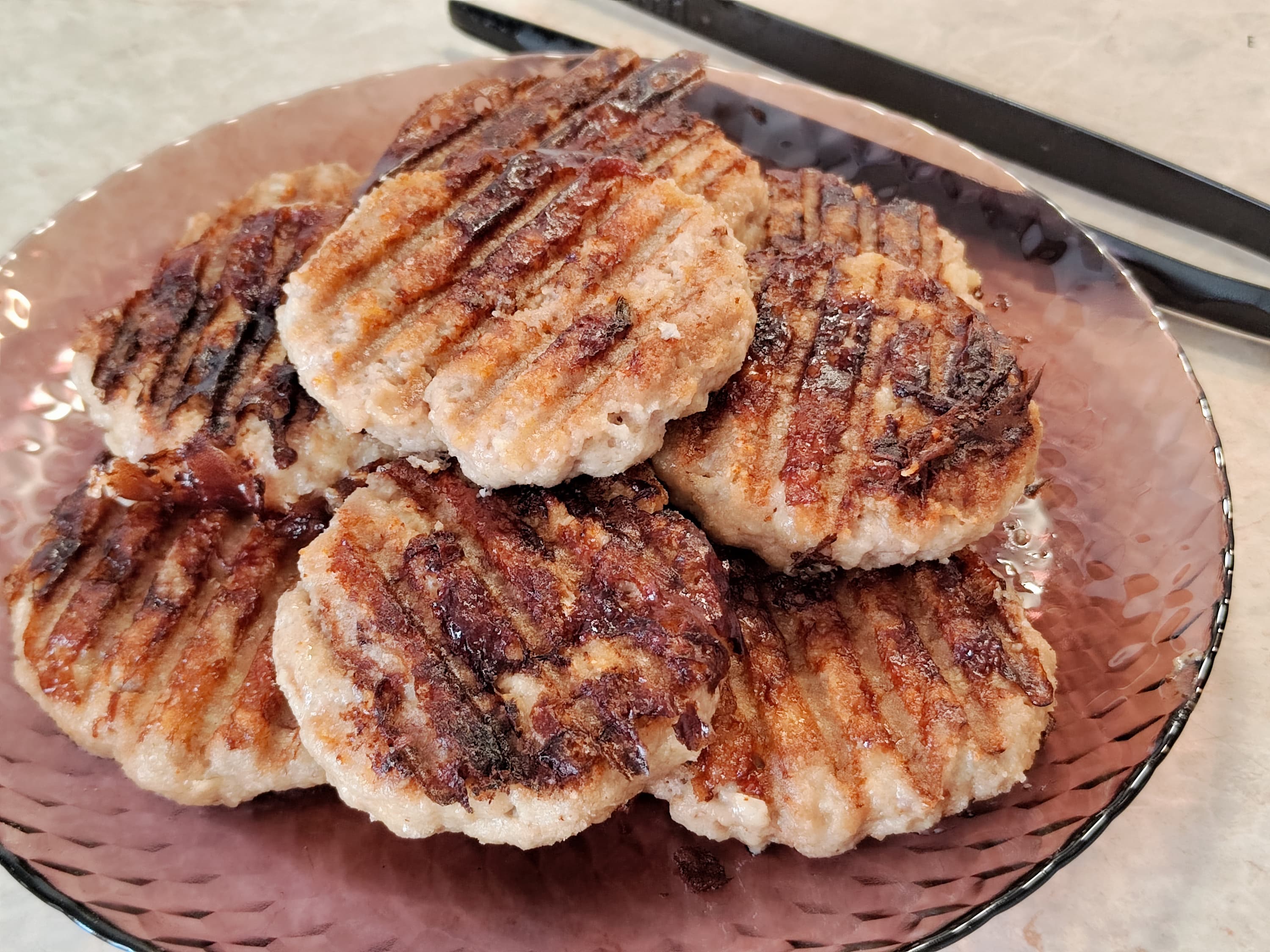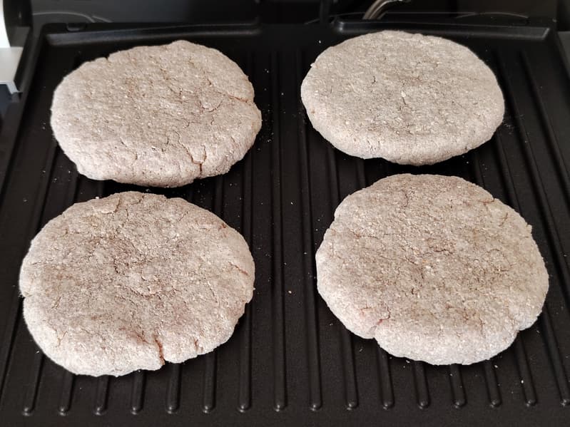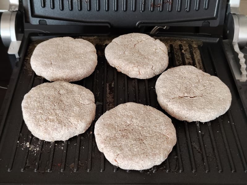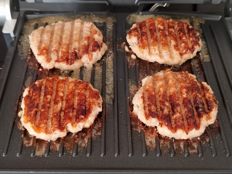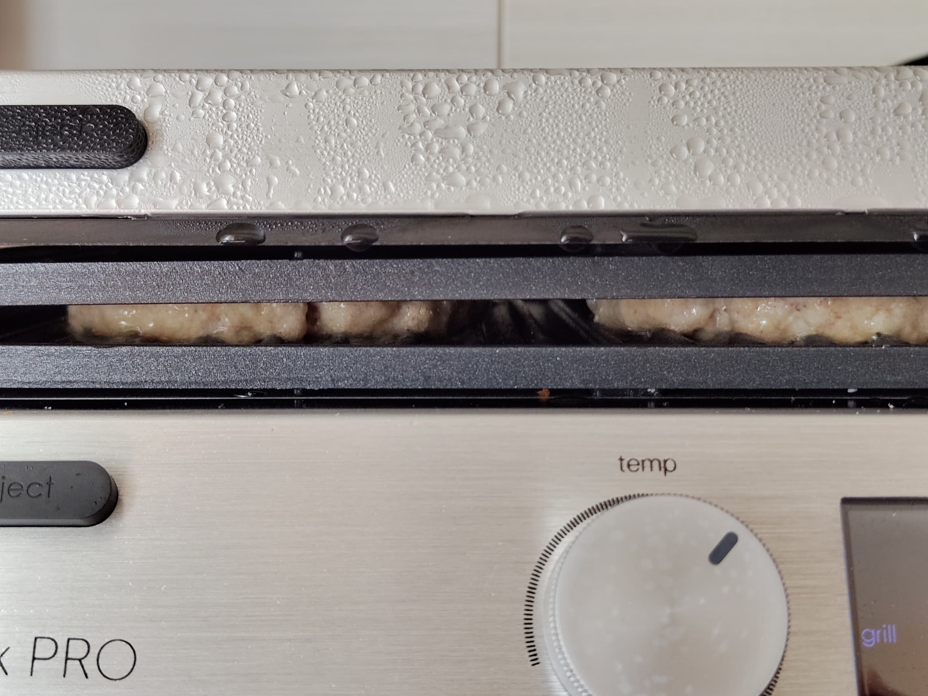 Первую порцию жарили в режиме прижимного гриля. Крышка сильно надавливала на изделия, сплющивая их. Впрочем, котлеты получились именно той высоты, которая и нужна — около 1-1,5 см. Жарили на 210 °C в течение 5 минут.