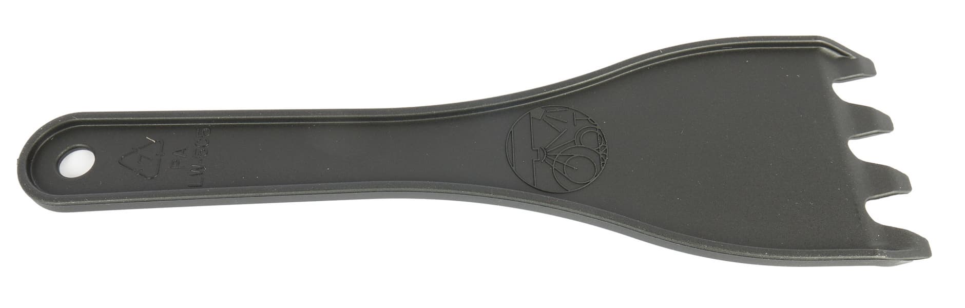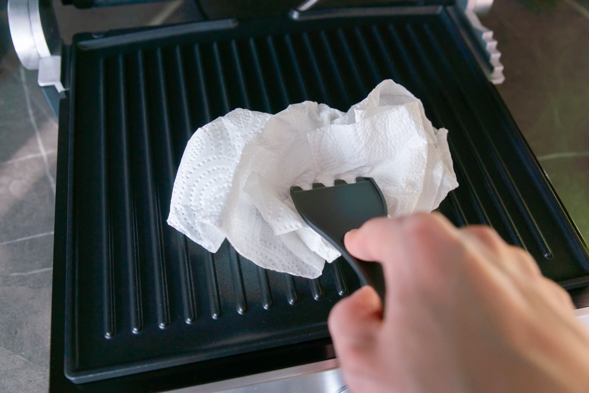 Уход за грилем совсем несложен, главное — не забывать очищать панели сразу после приготовления. Что радует — их можно мыть в посудомоечной машине. Также можно, не дожидаясь остывания прибора, аккуратно, не касаясь горячей поверхности, положить на них влажное полотенце или салфетки и закрыть крышку. Через три-пять минут раскрыть гриль, убрать салфетку и протереть поверхность панелей сухой мягкой тканью или бумажной салфеткой. Удобно это делать при помощи специального скребка, идущего в комплекте — таким образом, как на фото ниже.