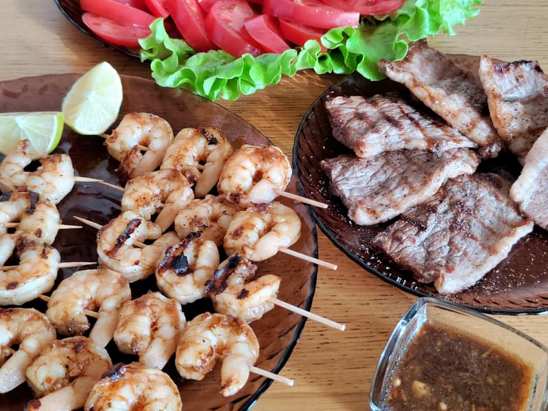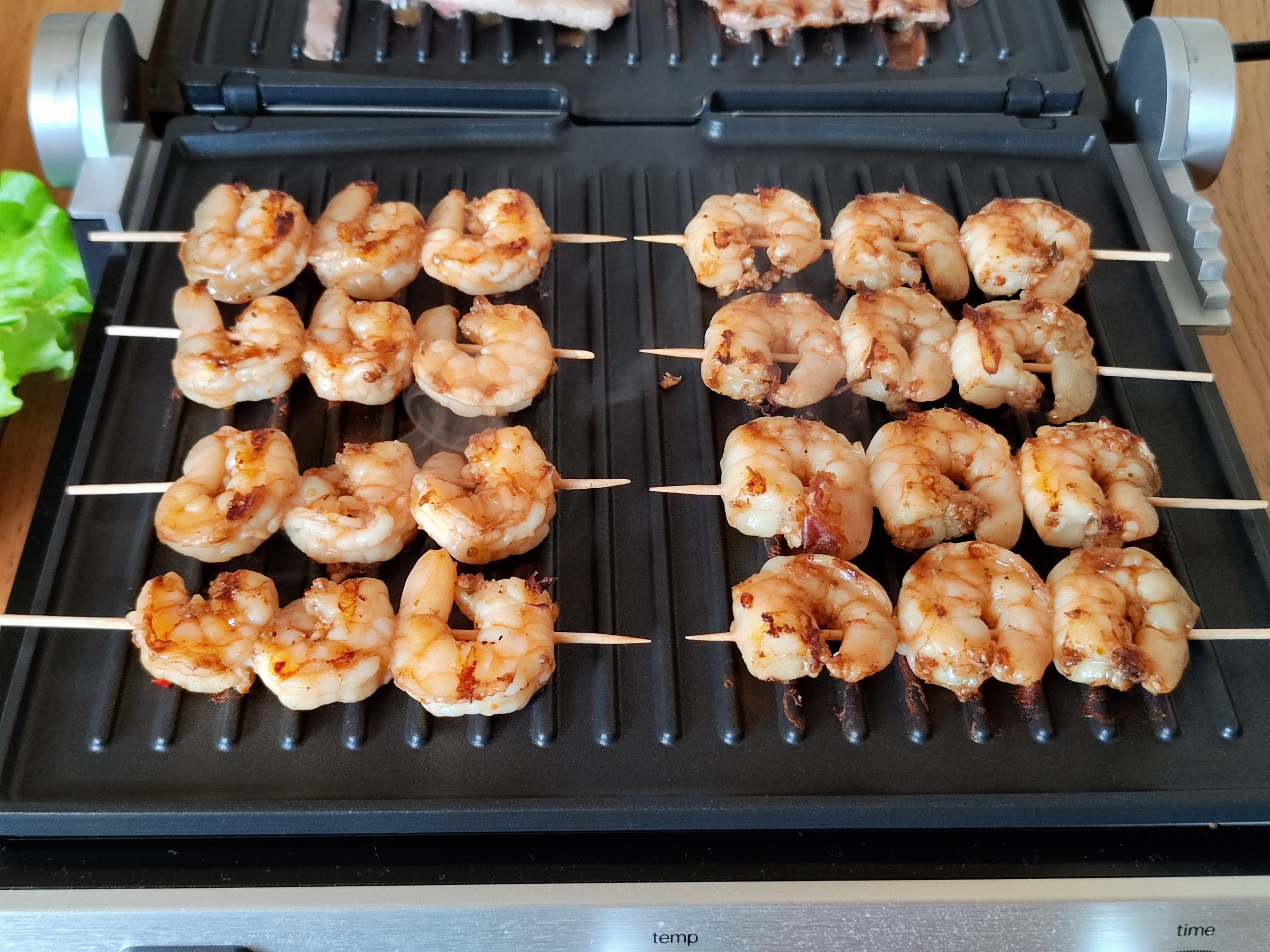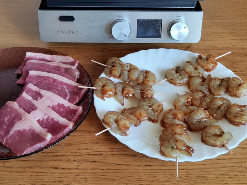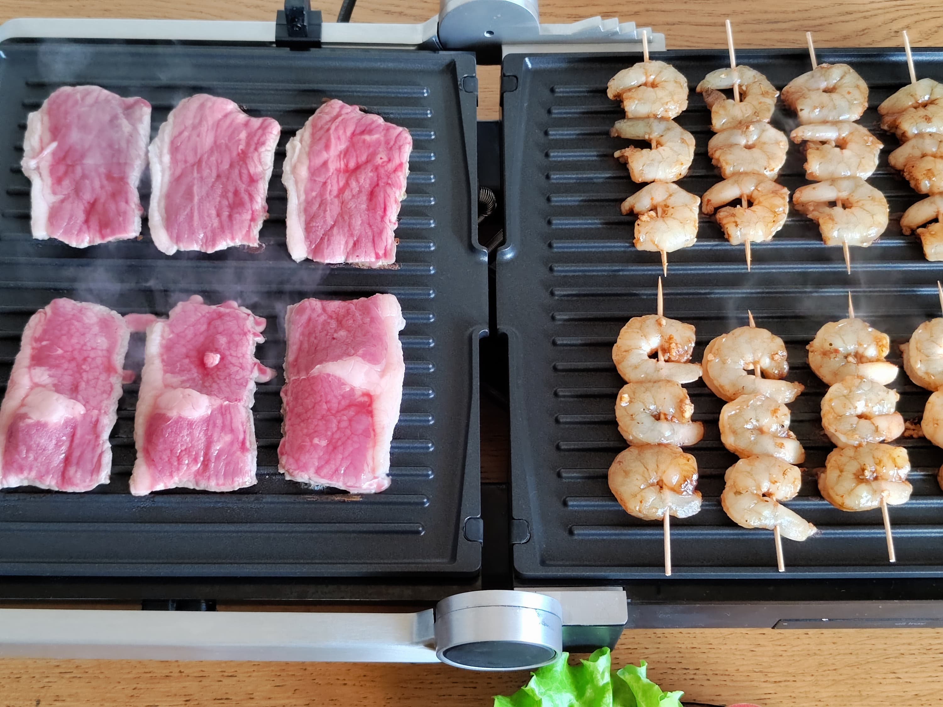 Раскалили гриль до максимальных 240 °C. После сигнала раскрыли панели на 180°. На одну половину выложили креветки, на другою — тонкие ломтики говядины. Радует, что за поверхность стола можно не переживать, поскольку наружные стороны гриля практически не нагреваются.