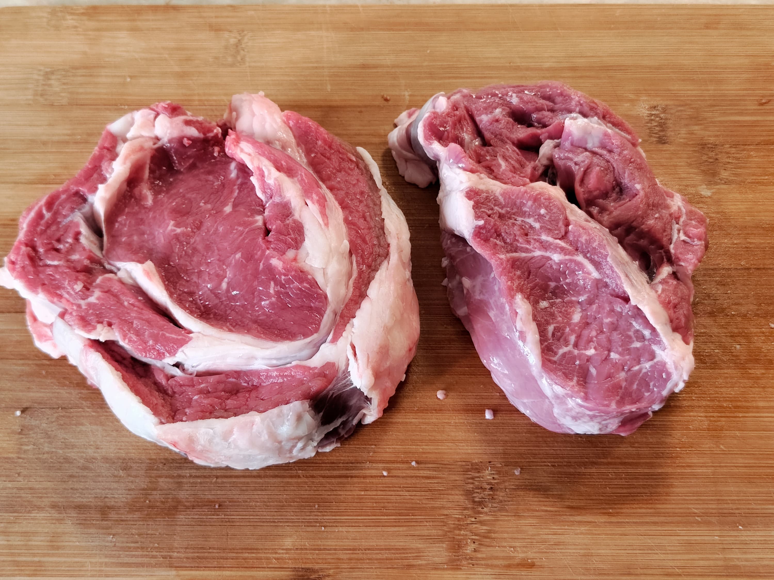 Мясо извлекли из холодильника примерно за час до теста, чтобы оно «прогрелось» до комнатной температуры. Сполоснули и промокнули бумажными полотенцами. Солить и перчить не стали, лишь слегка смазали растительным маслом. Большой кусок в самом высоком месте оказался толщиной около 4,5 см, маленький чуть пониже. Как показывает наш опыт, крышка гриля всех уравняет примерно до 3,5-4 см.