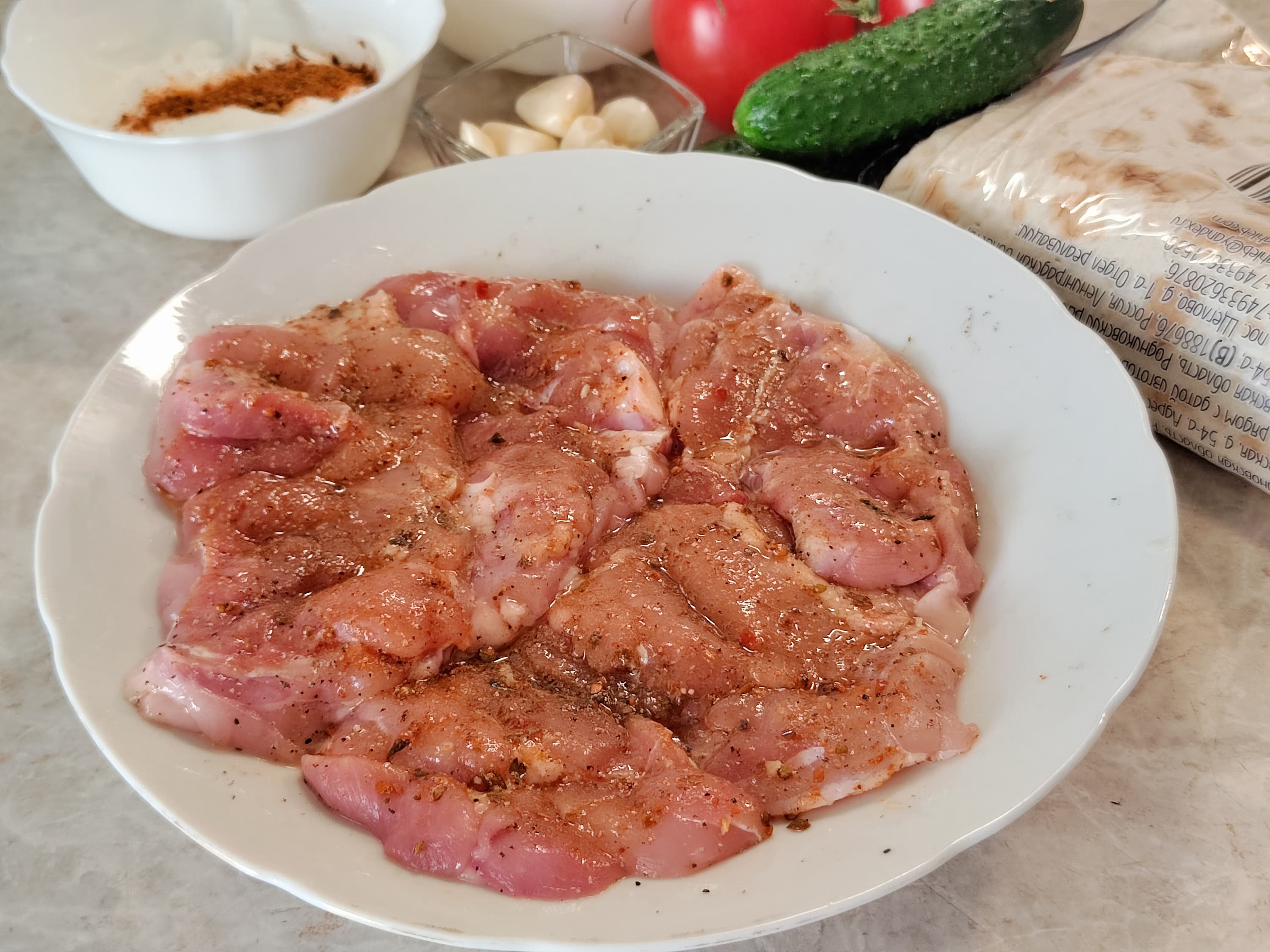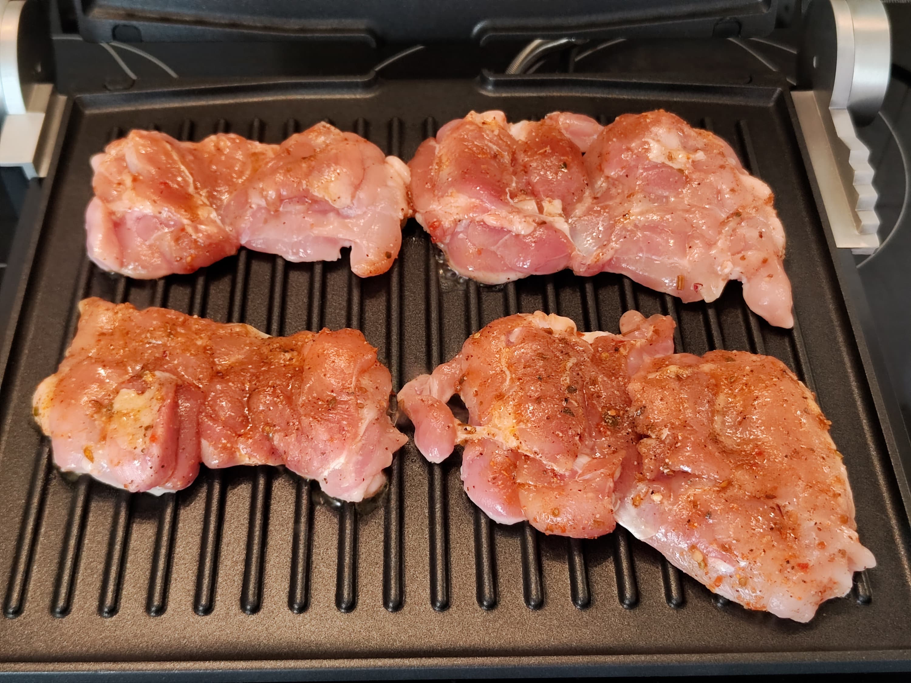 Четыре филе куриных бедер замариновали в смеси соли, специй и растительного масла.