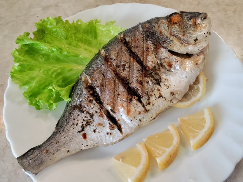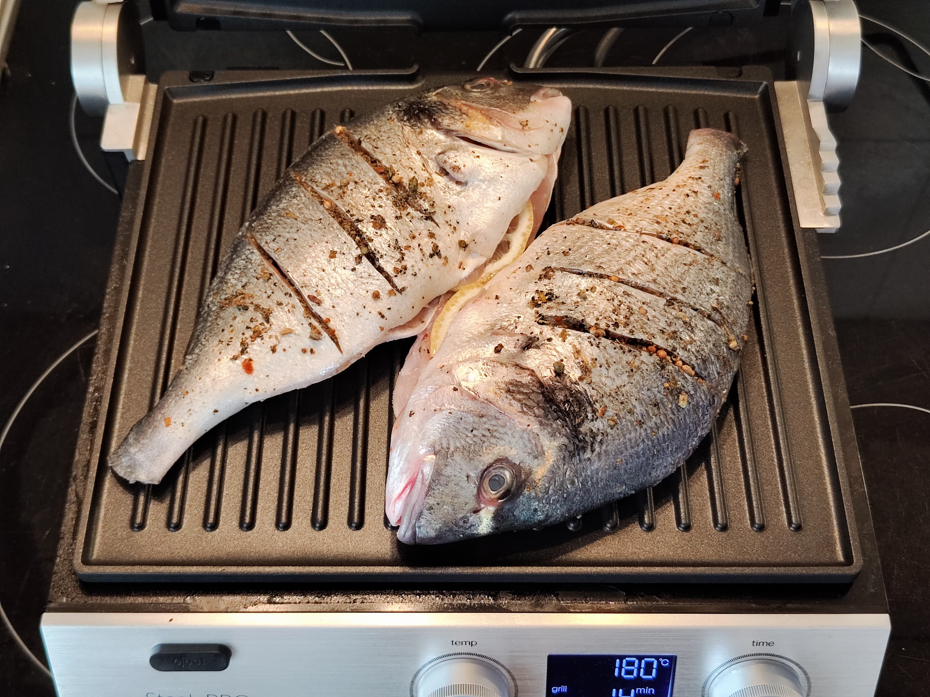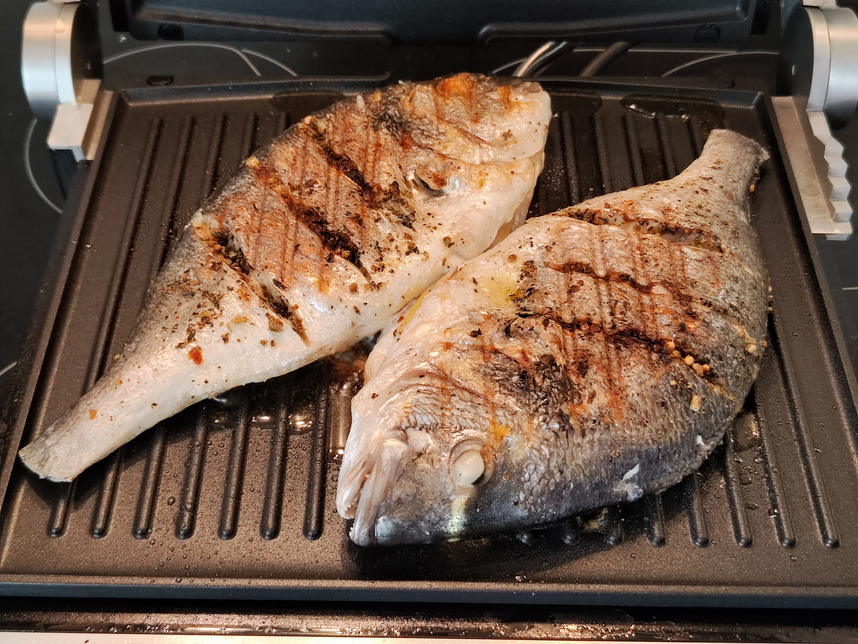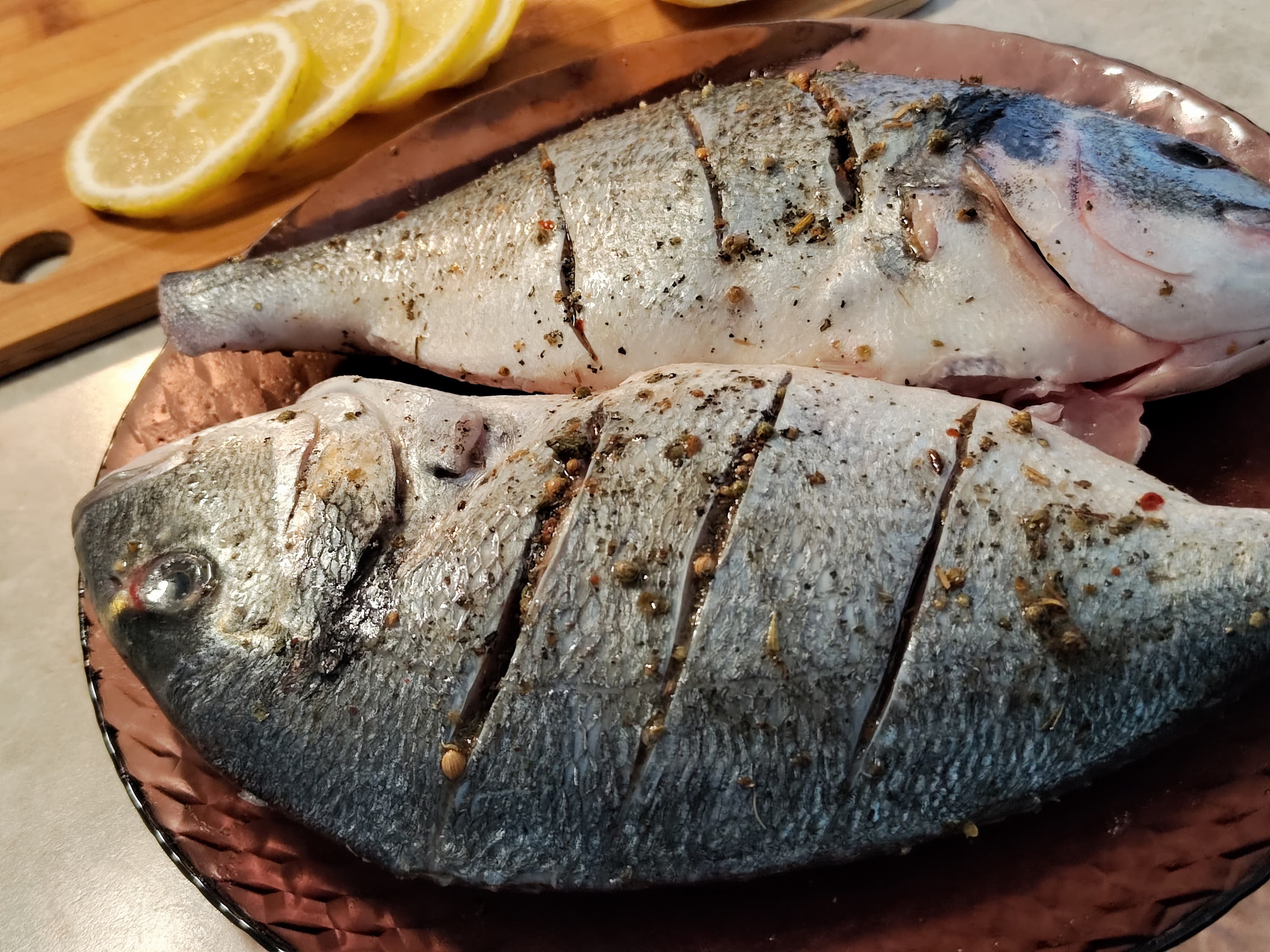 До сего дня автор никогда не жарил рыбу в гриле целиком. Обычно мы готовим филе или стейки лосося, но тут мимо проплывала дорада. Рыба не очень толстая в области хребта, достаточно жирная, чтобы хорошо запечься. От задумки до реализации нас разделил один час, который дорада провела в маринаде.