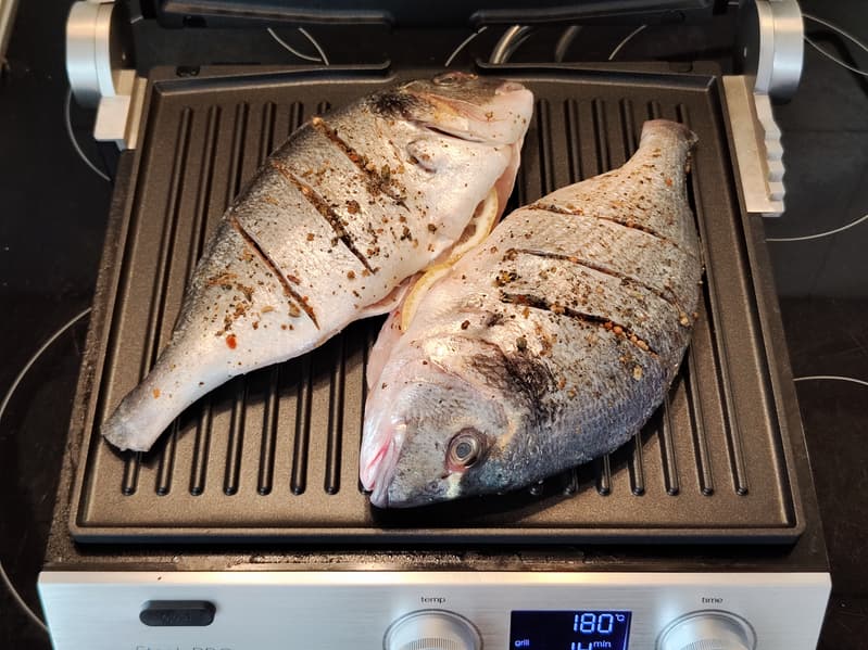 Задали следующие параметры работы: температура — 200 °C, продолжительность — 4 минуты. После звукового сигнала об окончании нагрева выложили филе на раскаленную панель.