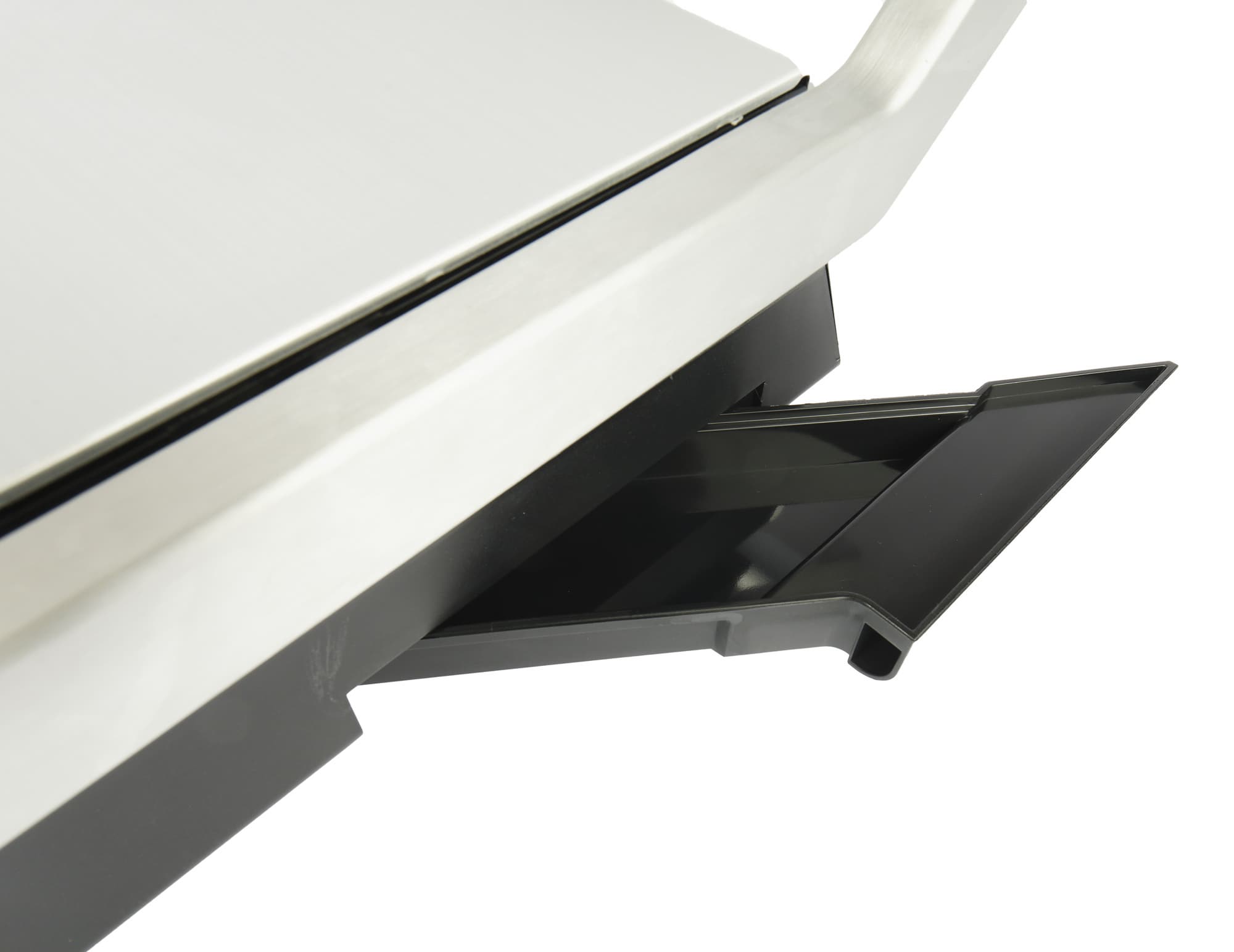Единственное, к чему мы можем придраться, это размер поддона для сбора жира и его размещение. Да, он с успехом собирает лишнюю жидкость, стекающую в него по специальному желобку при закрытой крышке в процессе жарки, но при открывании капли конденсата или жира с верхней панели стекают не только строго в центр в сам лоток, но и по всей ширине панели, прямо на стол. Неприятность невелика, но всё же поверхность столешницы регулярно приходилось протирать.