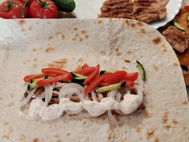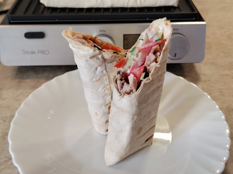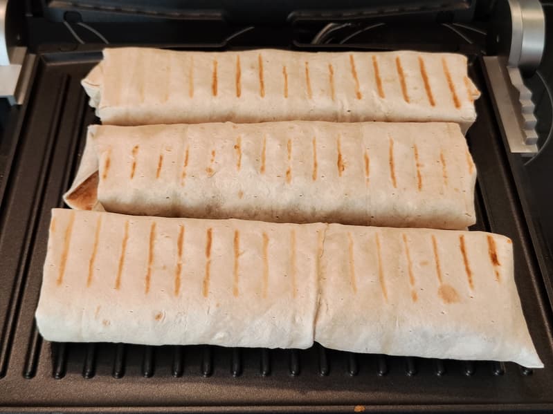 Свернули три шавермы и подрумянили их в течение пары минут на 220 °C. Цели хорошенько разогреть содержимое не было, потому что курица была еще теплой, а с поджариванием лаваша гриль справился быстро.