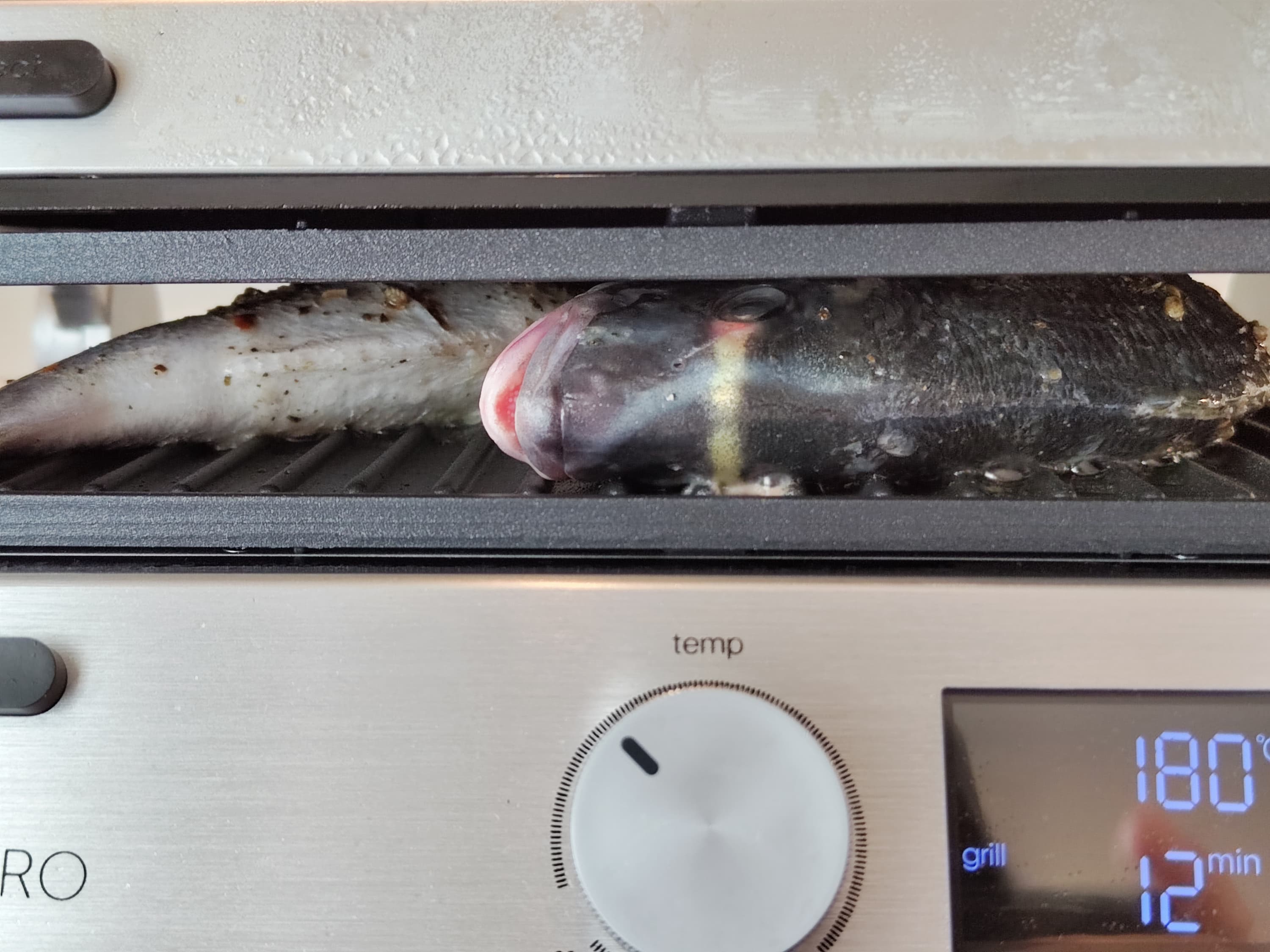 Планировали жарить 15 минут, но через пять минут захотелось повысить температуру до 190 °C. Готовили рыбу еще 8 минут. Затем вставили в глубину мякоти термометр, обомлели и немедленно всё отключили.
