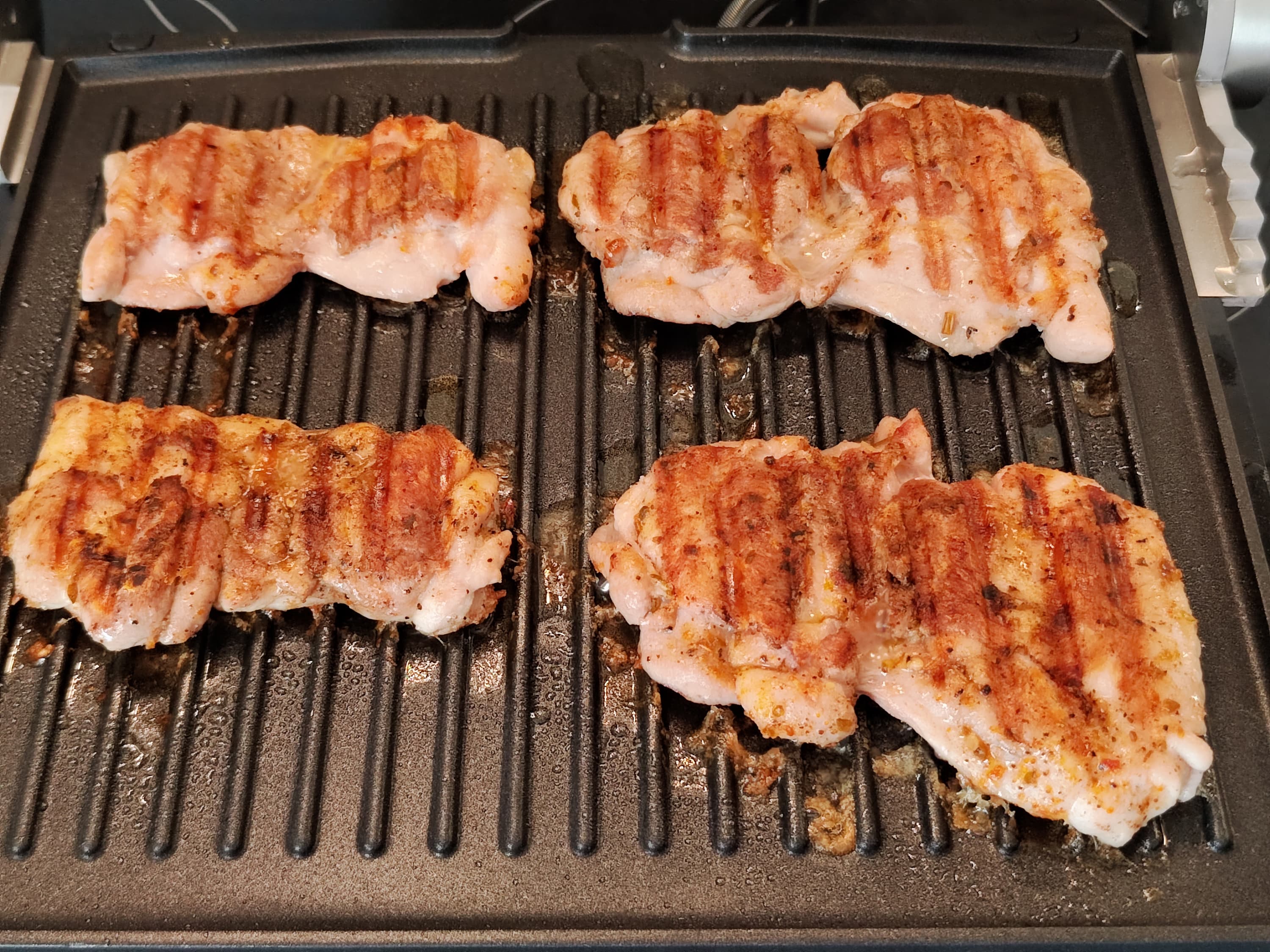 Жарили в режиме контактного гриля, т. е. прижав крышку гриля к продуктам. Влаги выделялось много, часть стекала в контейнер, часть испарялась с панелей и конденсатом оседала на лицевой стороне наружной части крышки гриля. Через 4 минуты посмотрели на филе, повысили температуру до 220 °C и добавили еще 3 минуты. На правой фотографии показана обратная сторона филе. С нижней стороны курица ожидаемо подрумянилась чуть меньше, чем сверху, поскольку сюда стекали сок и жир.