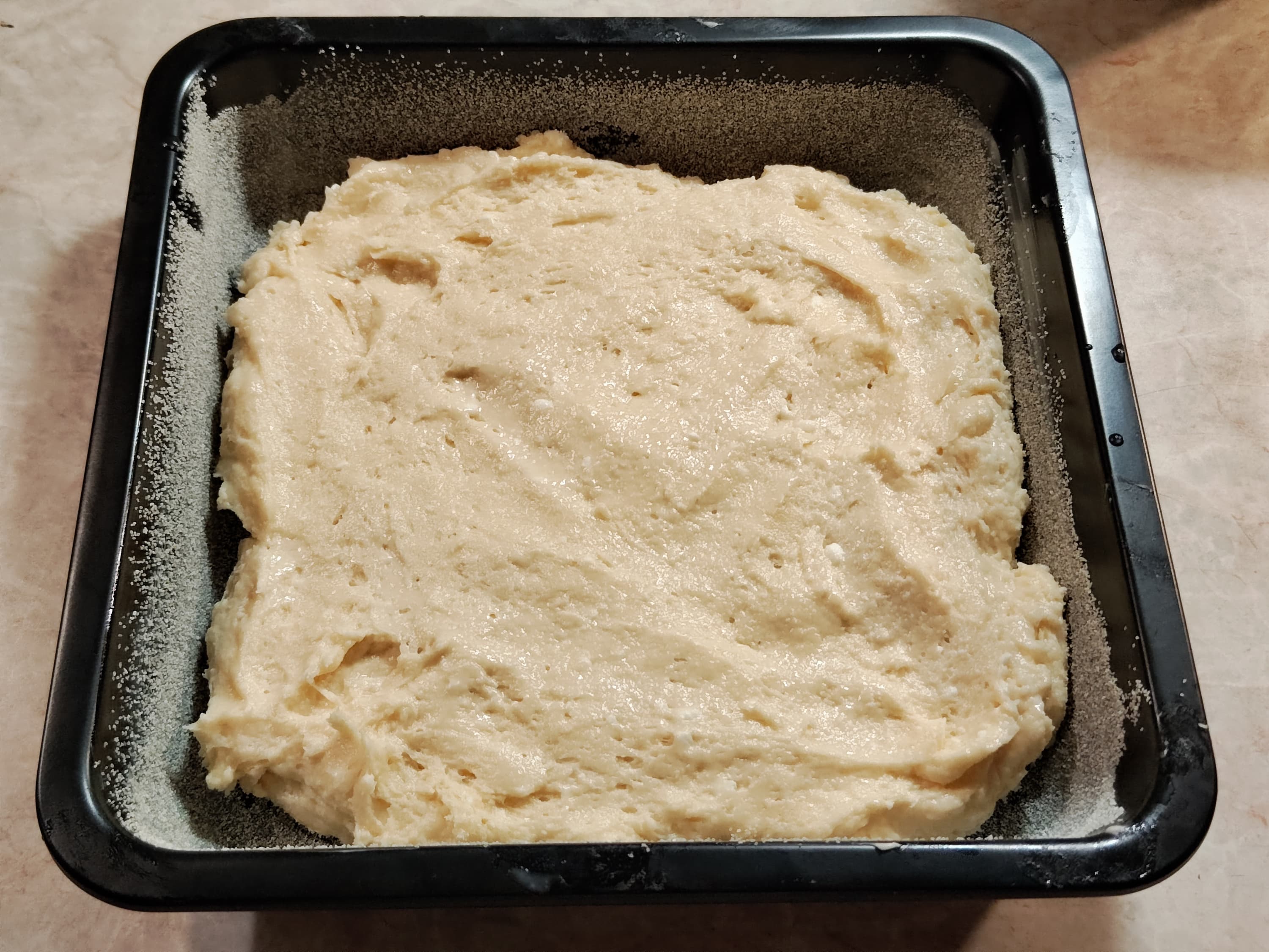 Взбили масло с сахаром, затем постепенно, не останавливая взбивание, добавили яйцо. Вмешали в пышную массу однородный некрупинчатый творог, просеянную муку и остальные сыпучие ингредиенты. Тесто получилось густое. Смазали комплектную форму маслом, присыпали манкой и выложили массу, разровняв ее влажными ладонями.