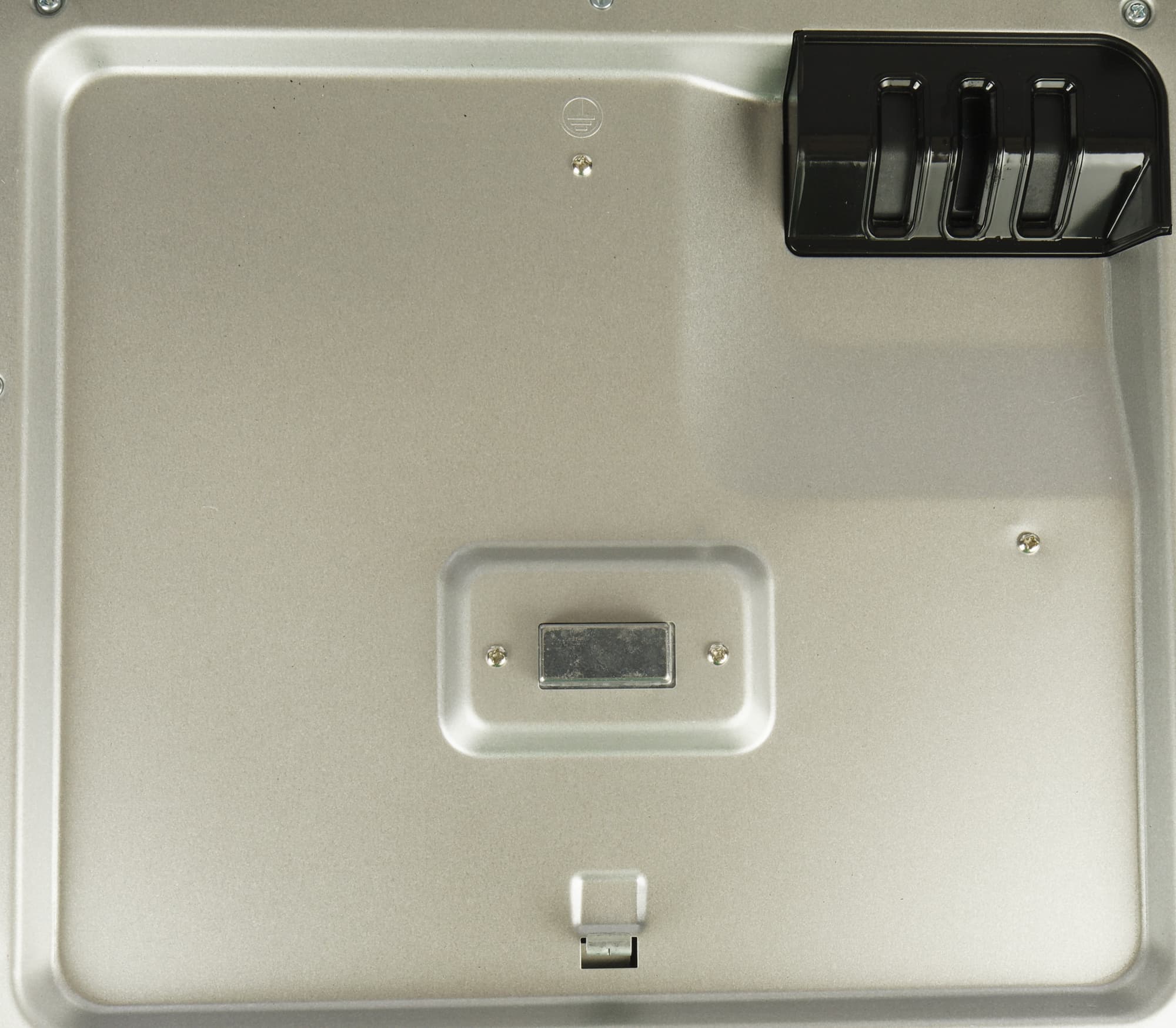 На дне гриля находятся вентиляционные отверстия, четыре ножки с противоскользящими накладками, отсек для намотки шнура и наклейка с технической информацией.