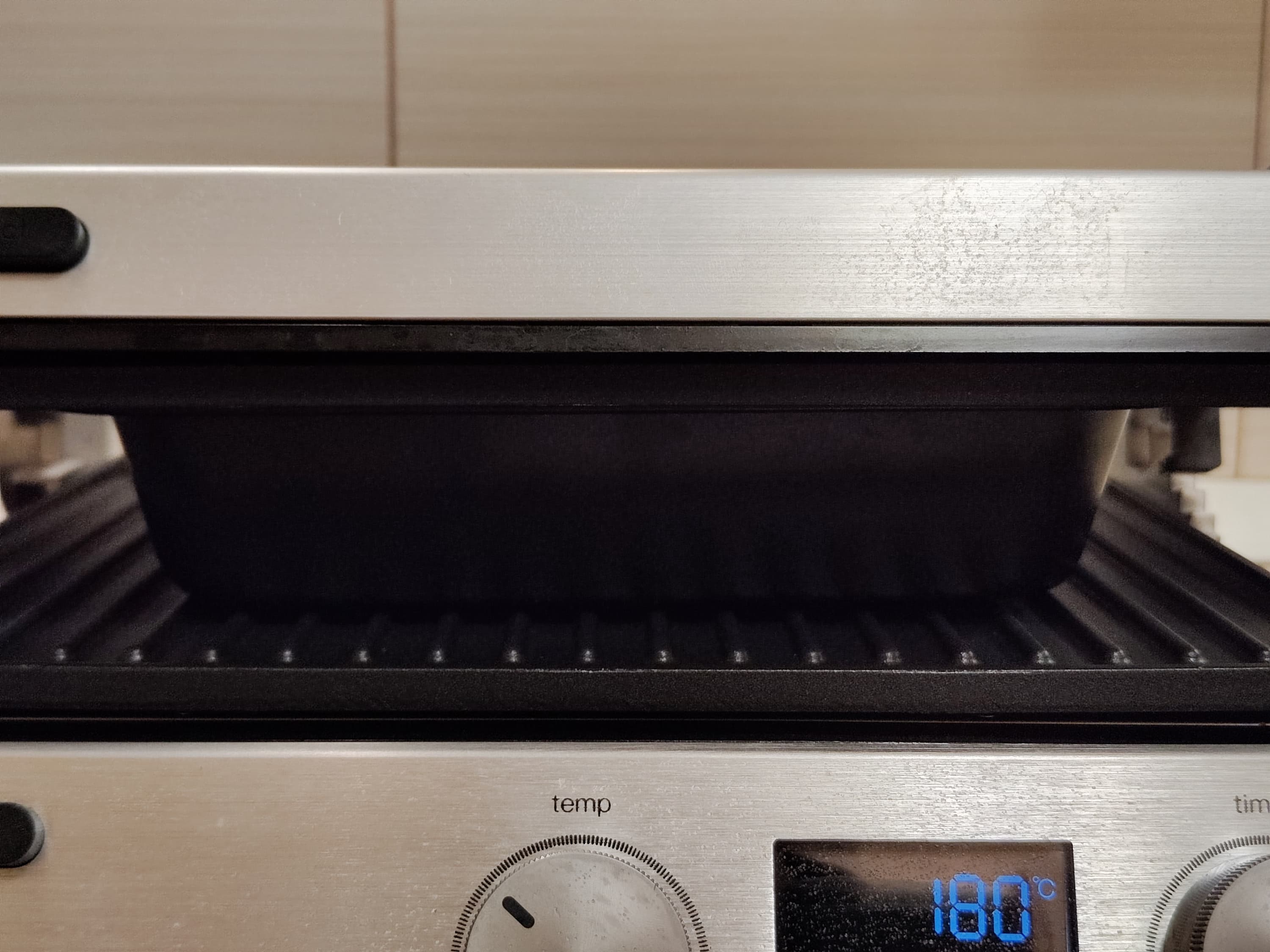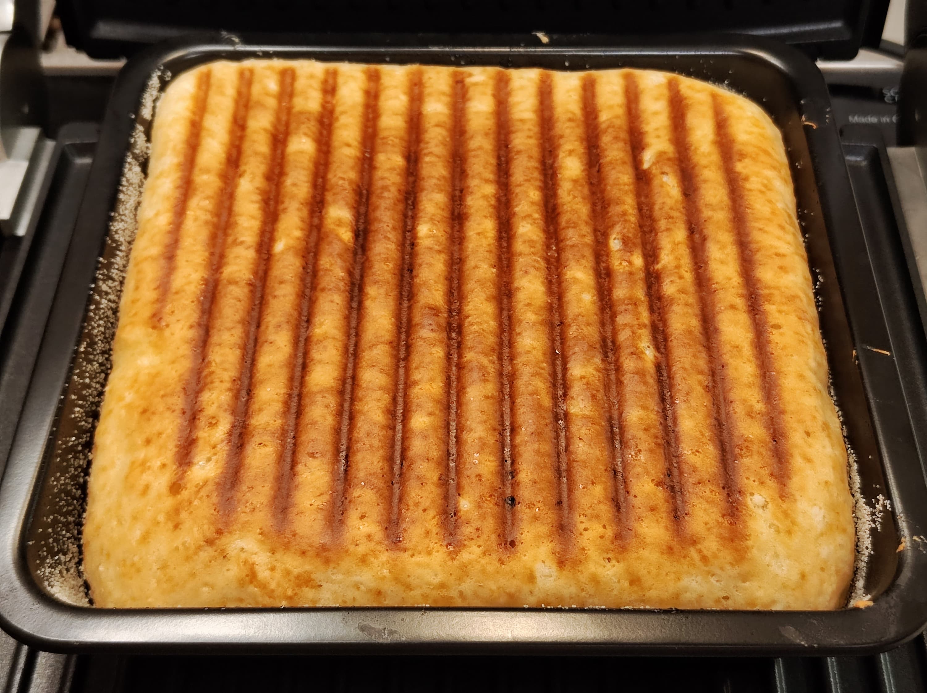 Выпекали в течение 30 минут на 180 °C. Верхняя панель гриля лежит на форме, при выпечке следует учитывать, что тесто увеличится в размерах и может подняться до высоты жарочной поверхности.