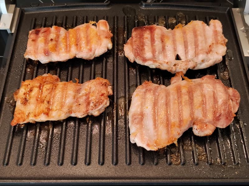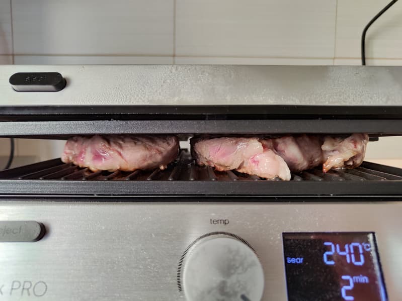 За всё время пребывания гриля у нас на тестировании мы не столкнулись ни с какими сложностями ни в работе с ним, ни в уходе за панелями. Никакие продукты в процессе приготовления не пригорали, всё готовилось равномерно и быстро. Масло мы не использовали совсем. Управление и вовсе не вызвало никаких вопросов, оно логичное и простое — справится любой. Параметры приготовления можно корректировать прямо в процессе.