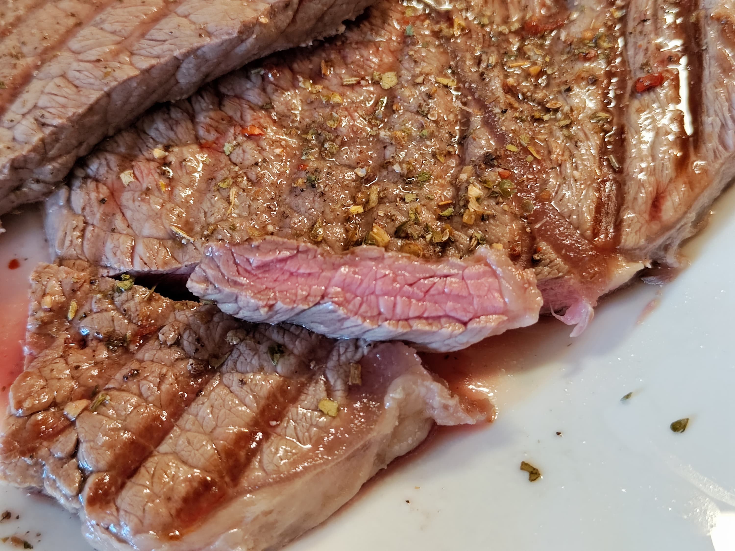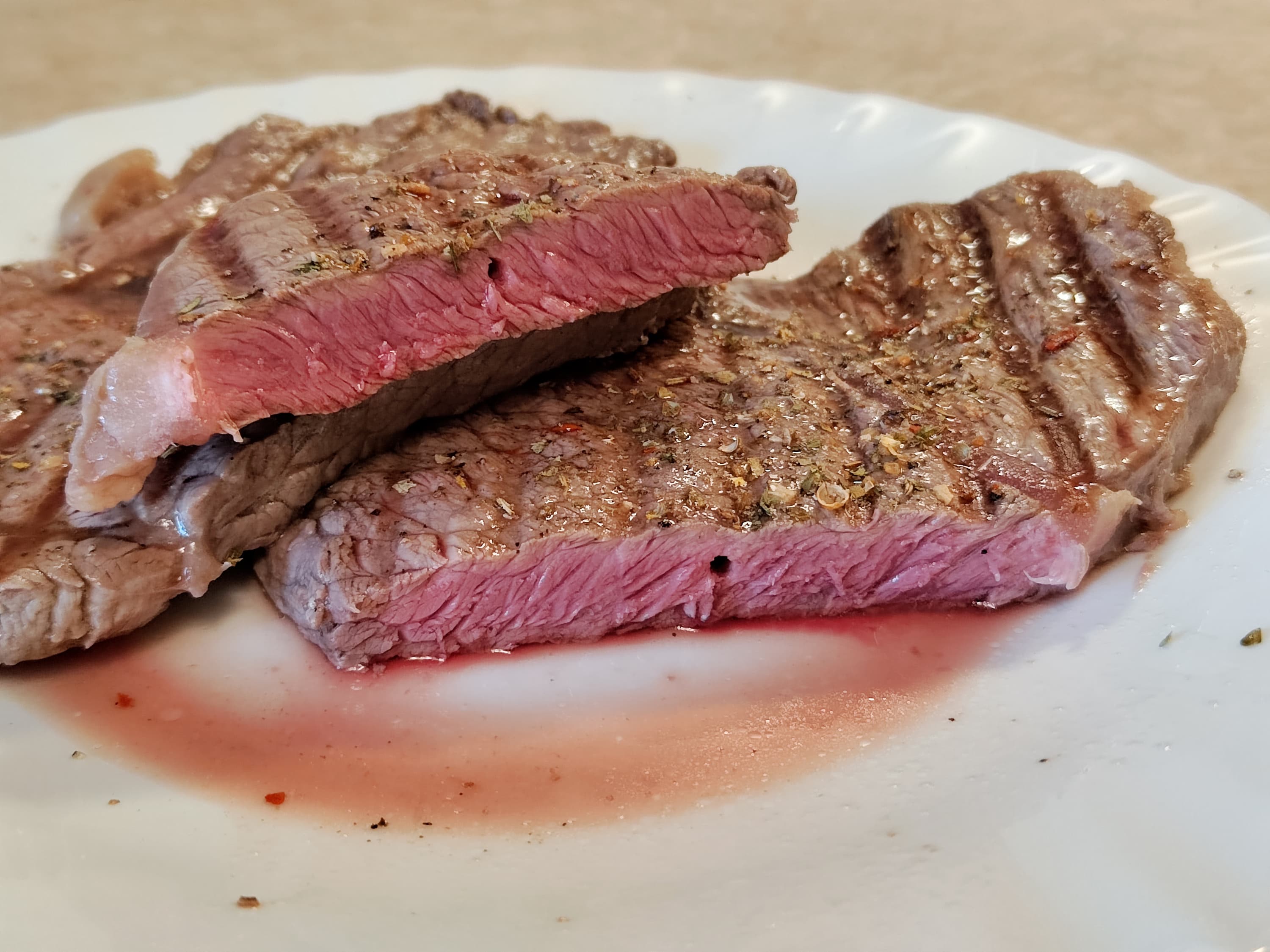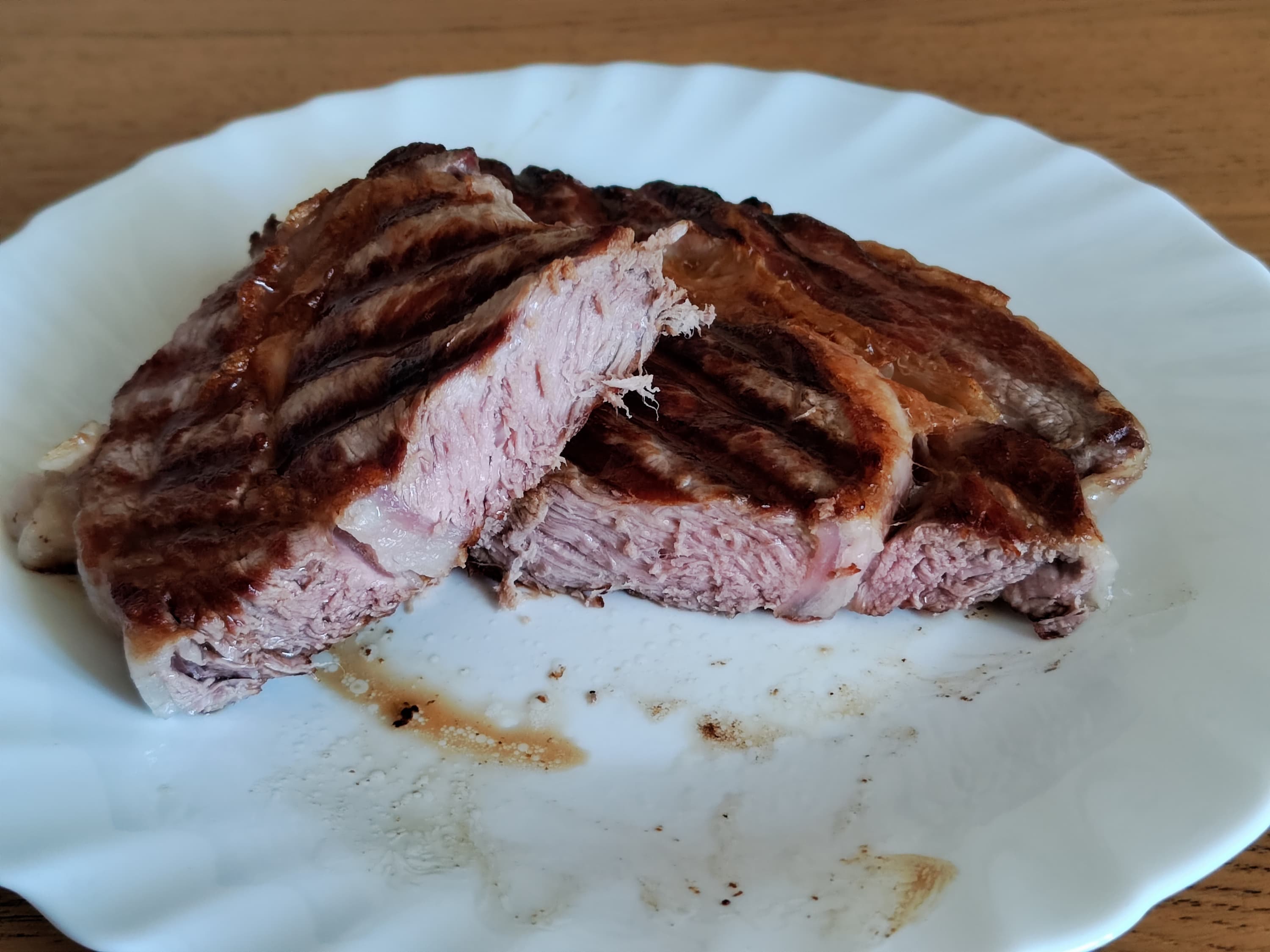 Однако остановиться было трудно. Всё же хотелось достичь прожарки medium rare. Настолько толстого, как в предыдущем тесте, куска нам не встретилось, поэтому взяли в магазине говядину для стейка одной широко известной марки. Общий вес двух кусков составил 390 г, толщина нас огорчила — в пределах одного стейка она колебалась от 1 до 2 см. Но мы не в Аргентине, и тем сложнее задача для гриля — приготовить, но не иссушить.