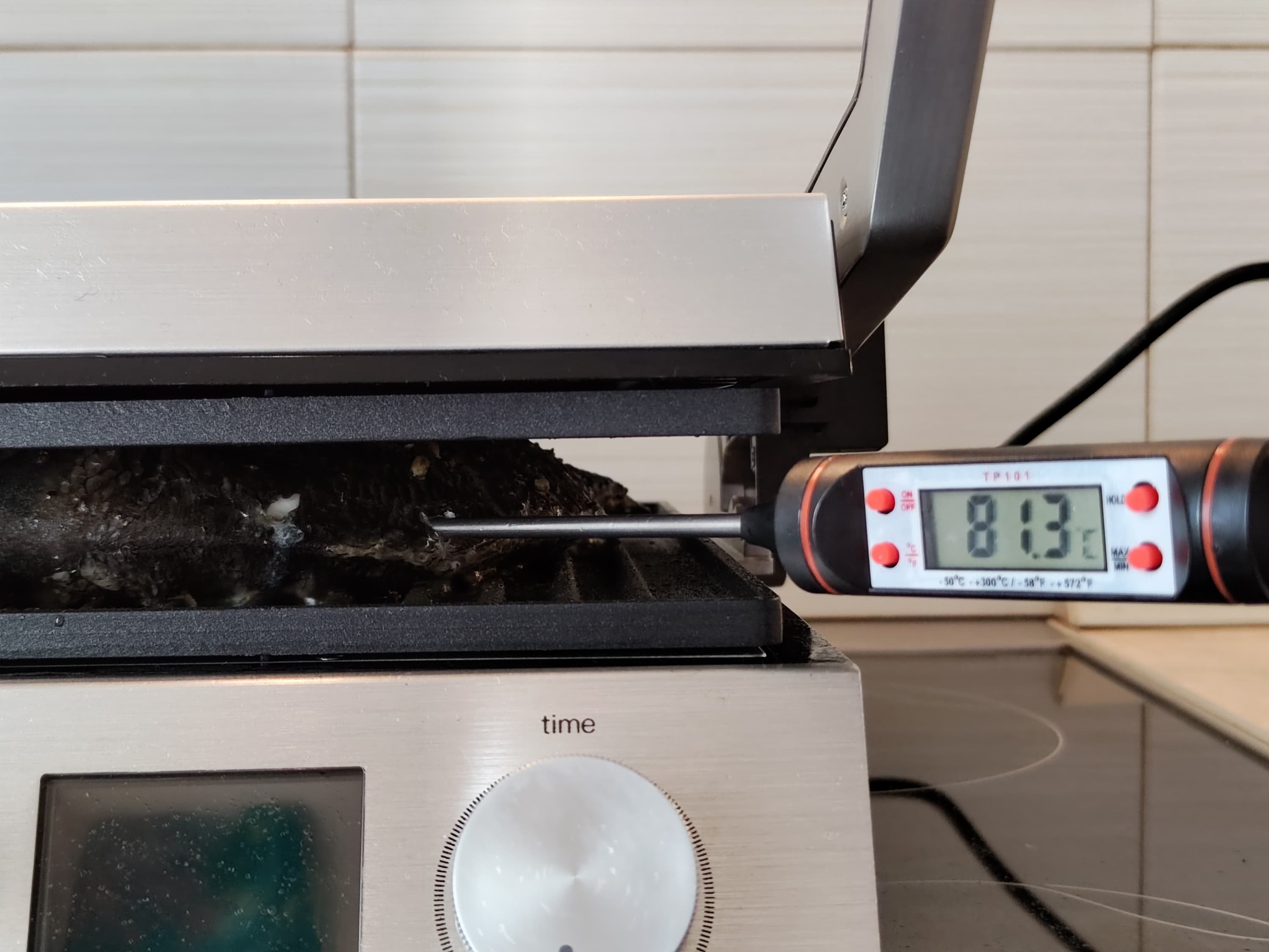 Затем снизили температуру до 200 °C и оставили мясо запекаться в течение еще пяти минут. Когда открыли крышку, сильно пожалели, что пренебрегли термощупом, понадеявшись на свой опыт и большое количество проведенных с Polaris PGP 3005 тестов. Мясо на вид было степени well done. Гриль все-таки жжет!