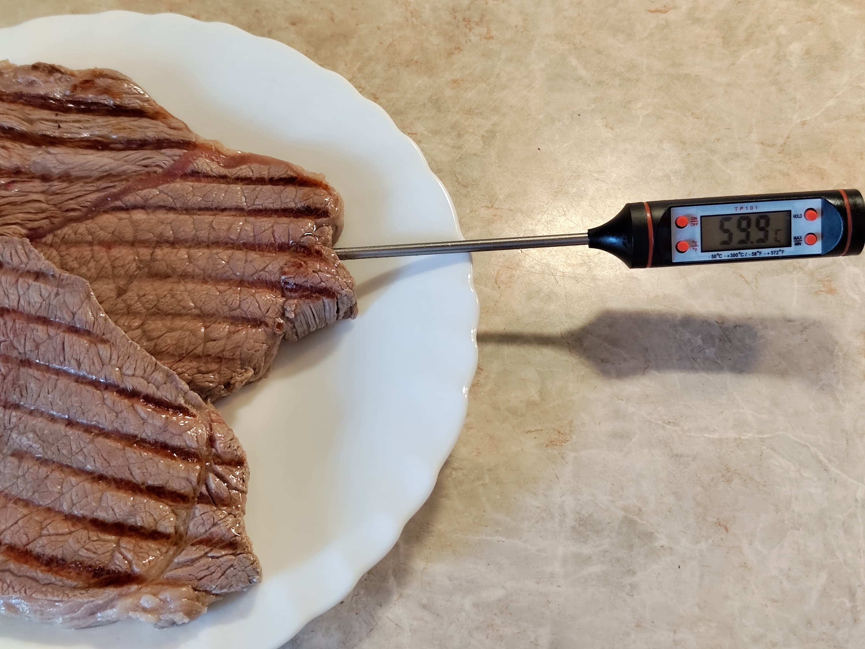 Нам удалось почти верно оценить толщину куска и необходимое для прожарки время. Если степень прожарки принципиальна, то лучше в подобных опытах полагаться на измерительные приборы, а не на глаз.