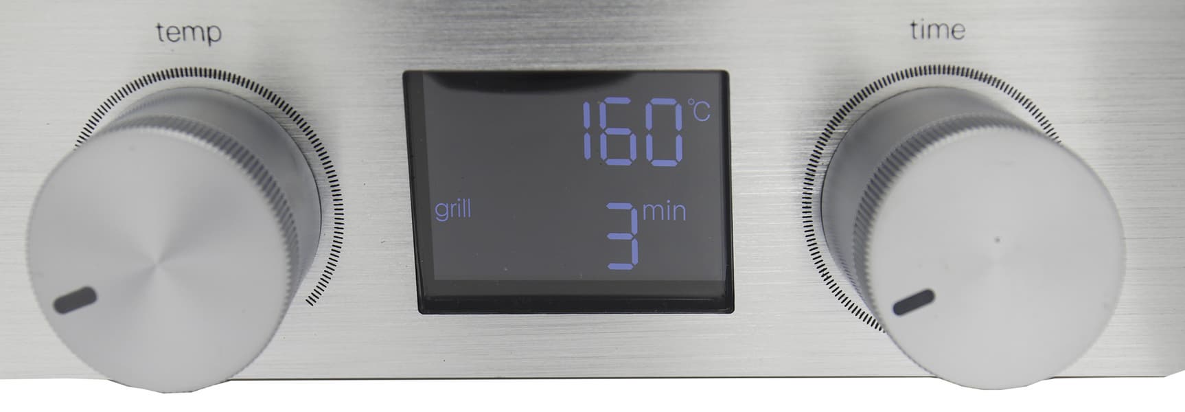 Панель управления, представленная дисплеем и круглыми поворотными регуляторами, устанавливающими температуру и время приготовления, расположены привычно, на лицевой стороне нижней части корпуса.