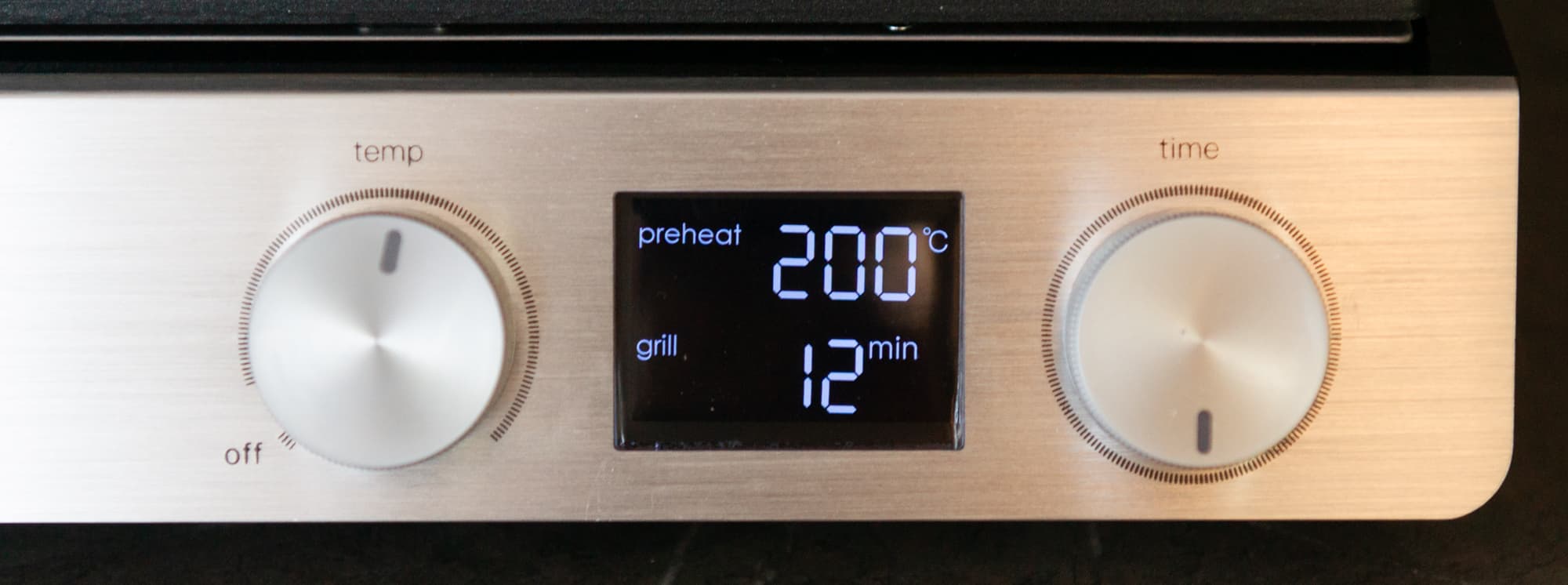 Управление грилем весьма несложное. Напомним, в наличии только два регулятора: времени и температуры. Между ними — дисплей.