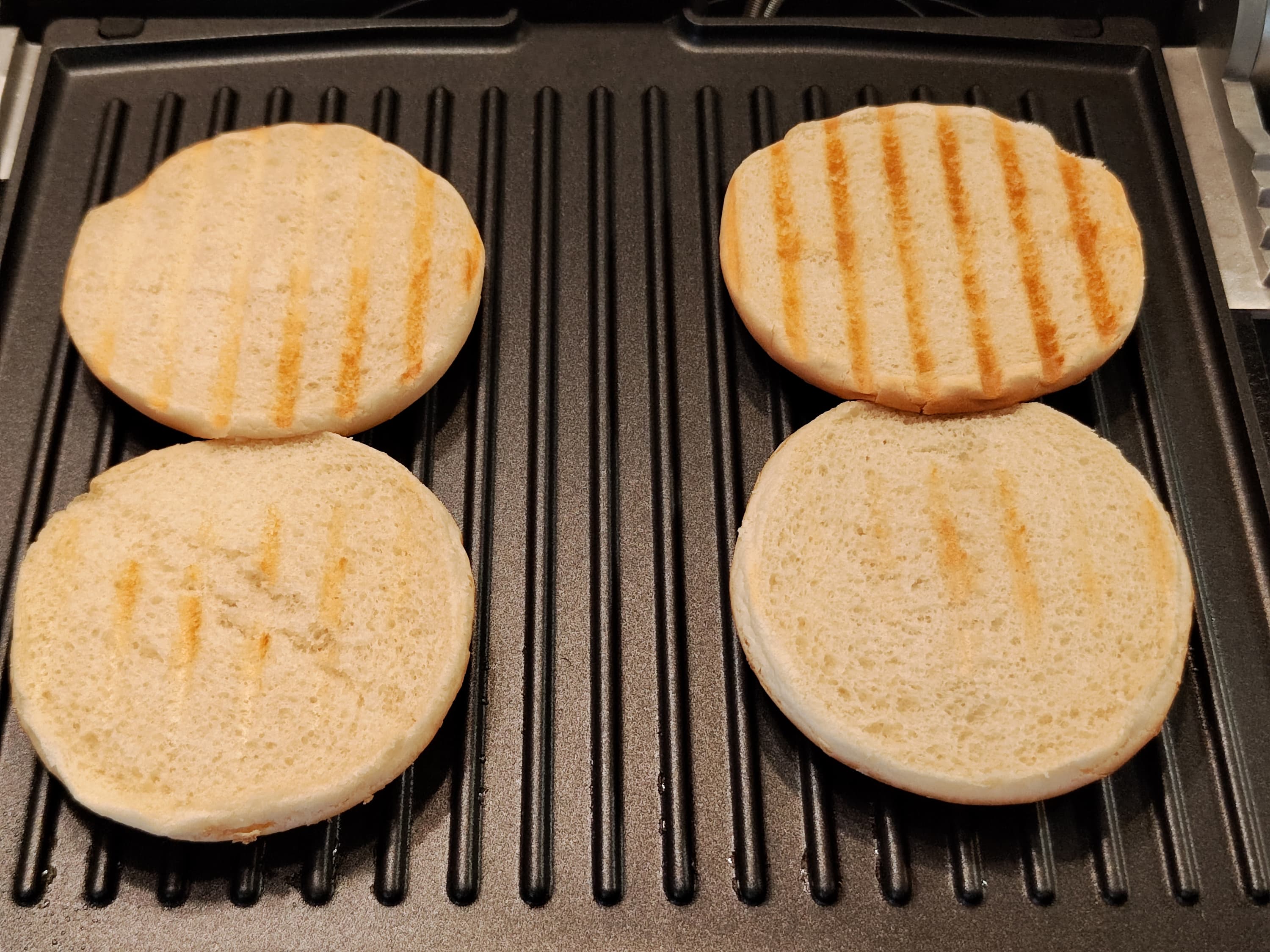 Затем слегка подрумянили половинки булочек на 180 °C в течение трех минут на первой высоте крышки. В режиме прижимного гриля сделать это было бы невозможно — булочки бы попросту сплющились. В ходе теста заметили одну особенность: крышка не фиксируется горизонтально, она сильнее надавливает на половинки булочек, лежащие в глубине, ближе к дальнему краю. Поэтому если нужно приготовить нежные продукты, которые нельзя сдавливать, то нужно устанавливать более высокий зазор между панелями и размещать кусочки ближе к наружному краю гриля.