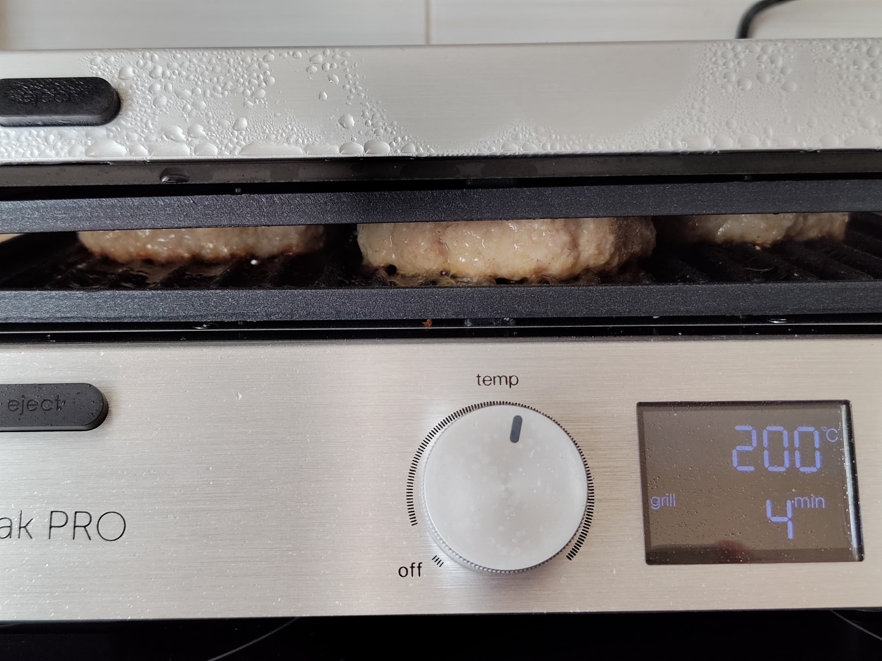 В данном тесте прибор функционировал в двух режимах — как контактный гриль и как мини-печь с зафиксированным положением крышки. Второй вариант позволил приготовить не слишком тонкие котлеты и поджарить булочку, не превратив ее в лепешку.