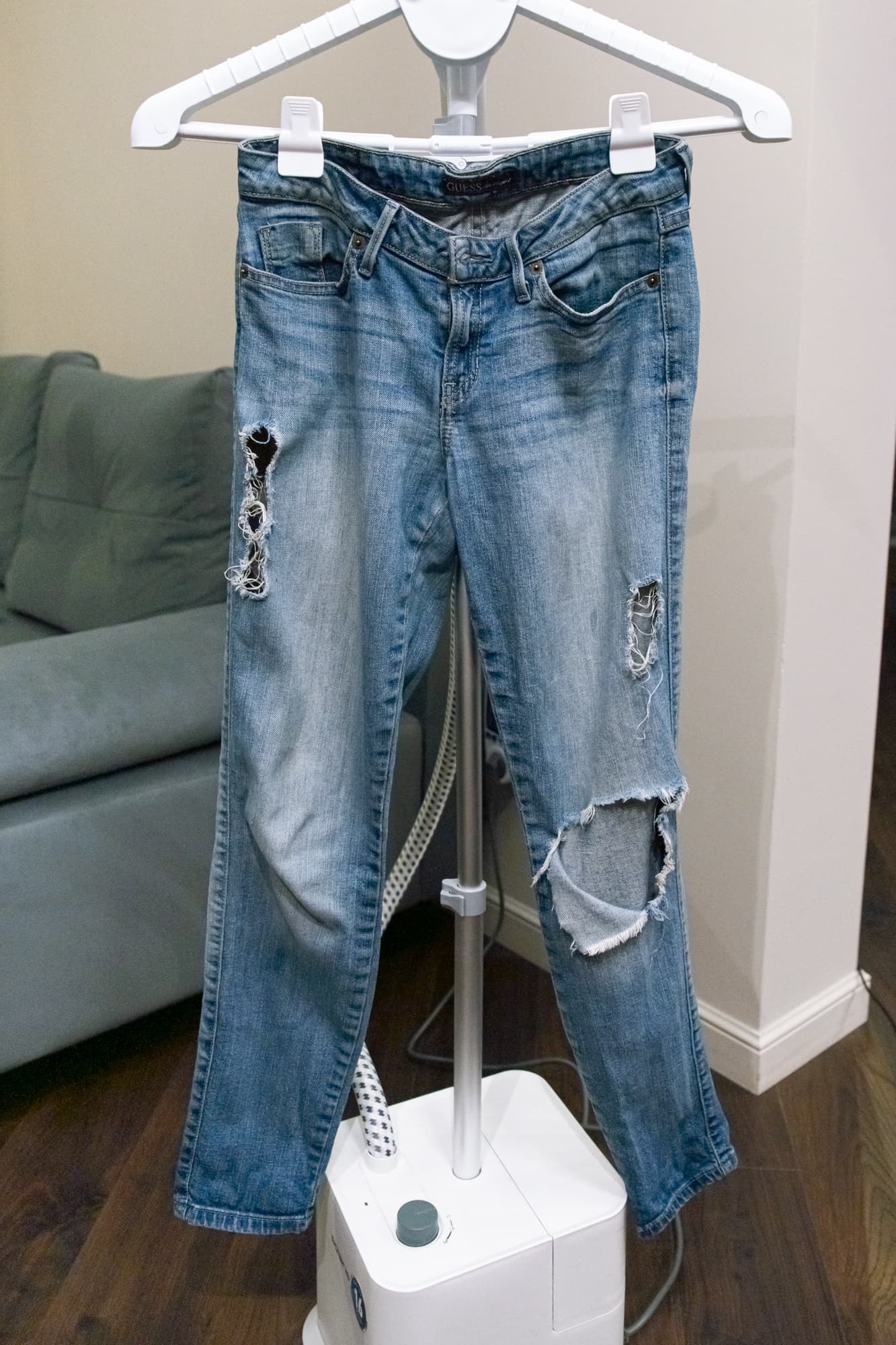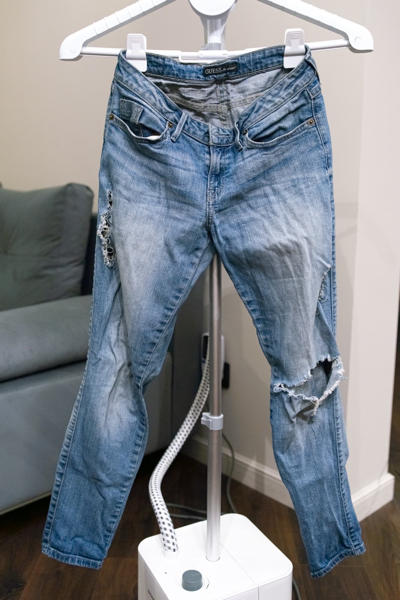 В отличие от брюк, джинсы отпарились быстро и полностью. Несмотря на плотность ткани и сильную измятость, привести эту вещь в порядок для отпаривателя не составило труда.