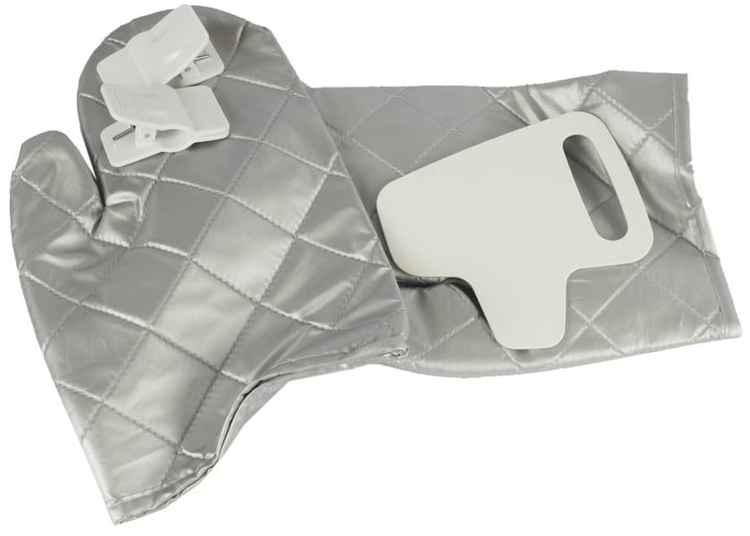 К отпаривателю прилагаются две термозащитные рукавицы из серебристой синтетической ткани (одна длиной 25 см, другая — 22 см) и пластина из твердого матового пластика для отпаривания воротников, манжетов и карманов.
