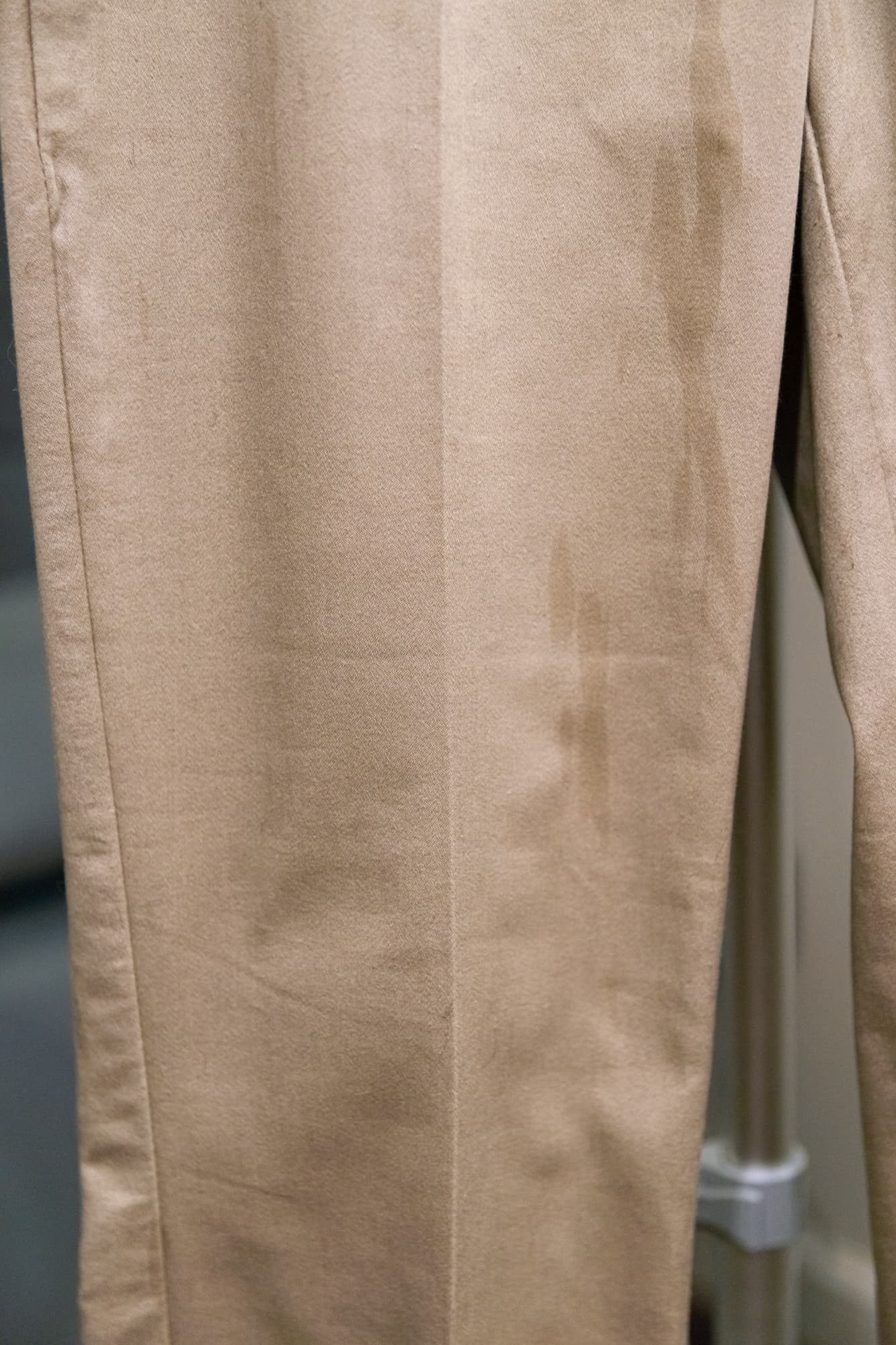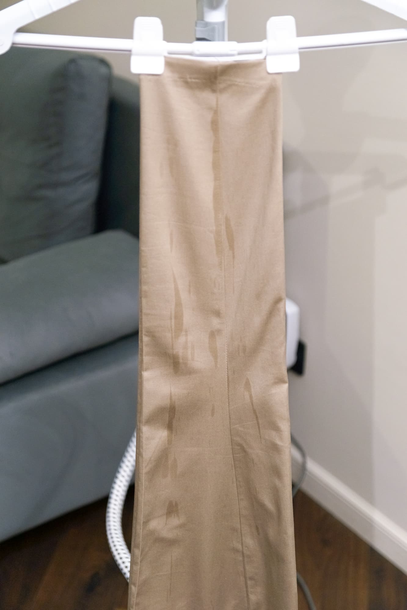 Брюки из плотной ткани, состоящей из 65% хлопка и 35% полиэстера мы отпаривали на комплектной вешалке с использованием зажимов.