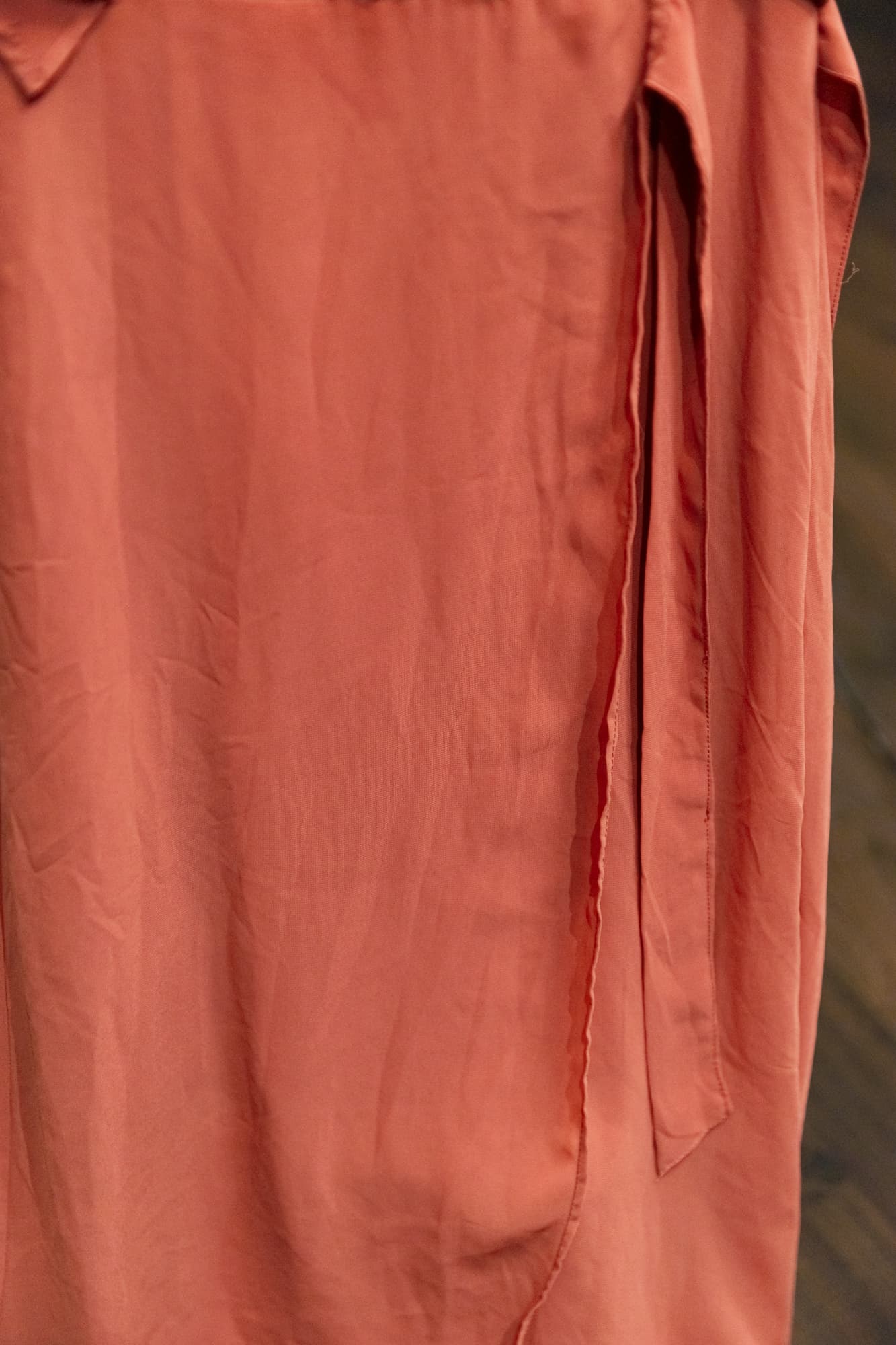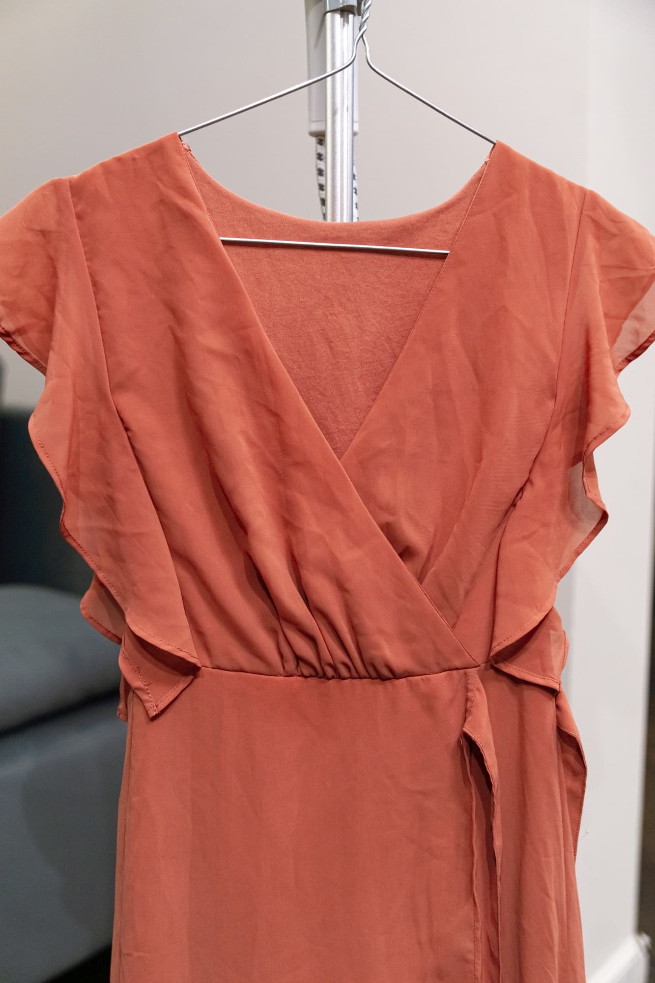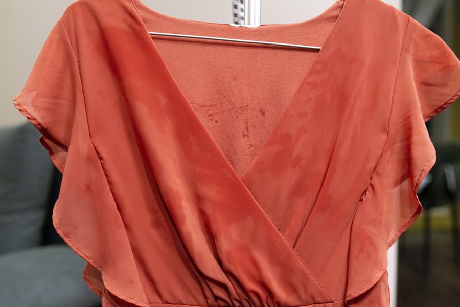 Шифон требует бережного обращения и на всякий случай отпаривать мы начали с самого низа. Быстро убедившись, что отпариватель благотворно влияет на материал, перешли на всю длину. Как и в предыдущих тестах, придерживали низ рукой и водили утюжком по ткани вплотную. Отпариватель совсем разошелся и вместе с паром несколько раз выплеснул на ткань приличную порцию воды. Она однако быстро высохла.