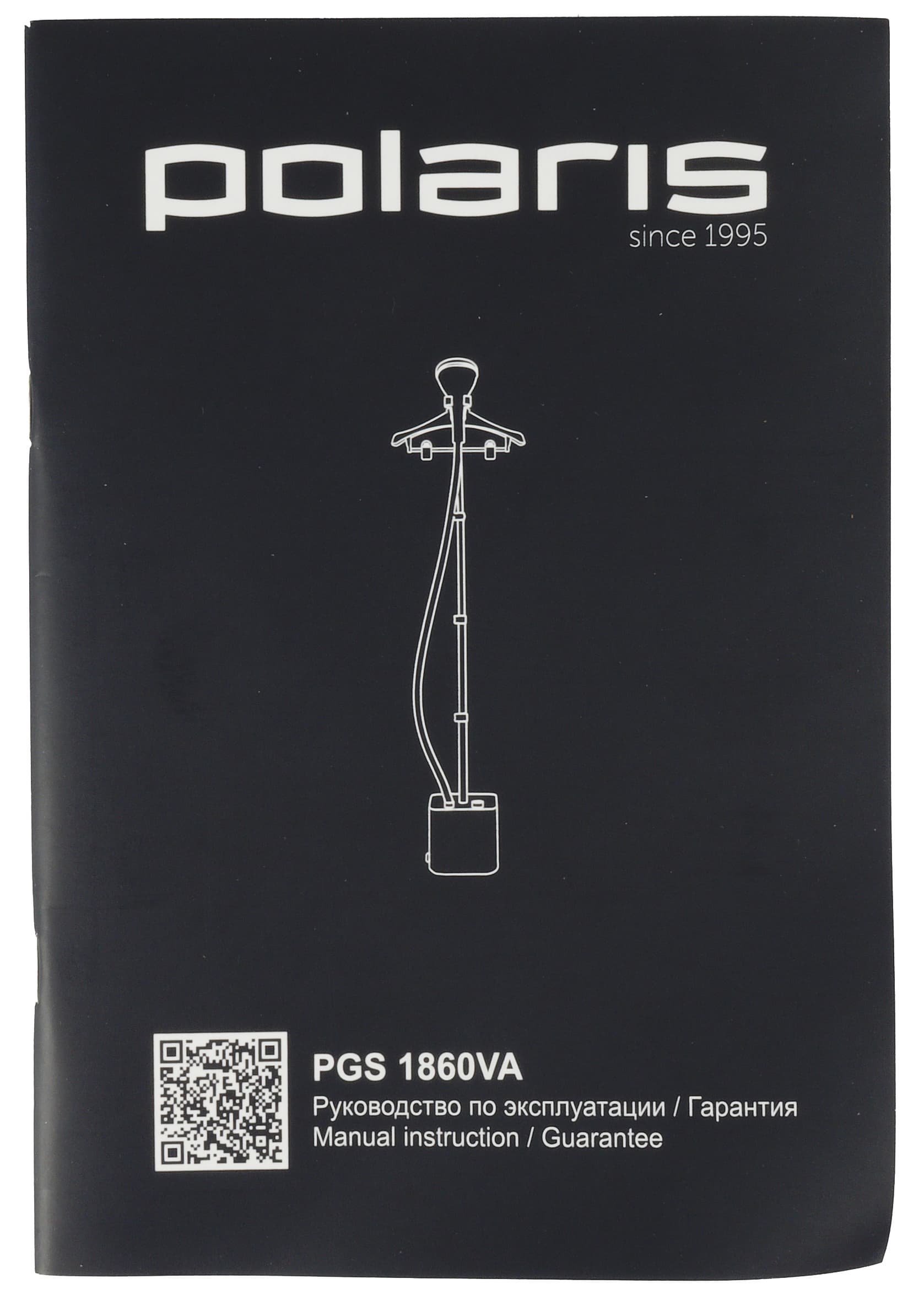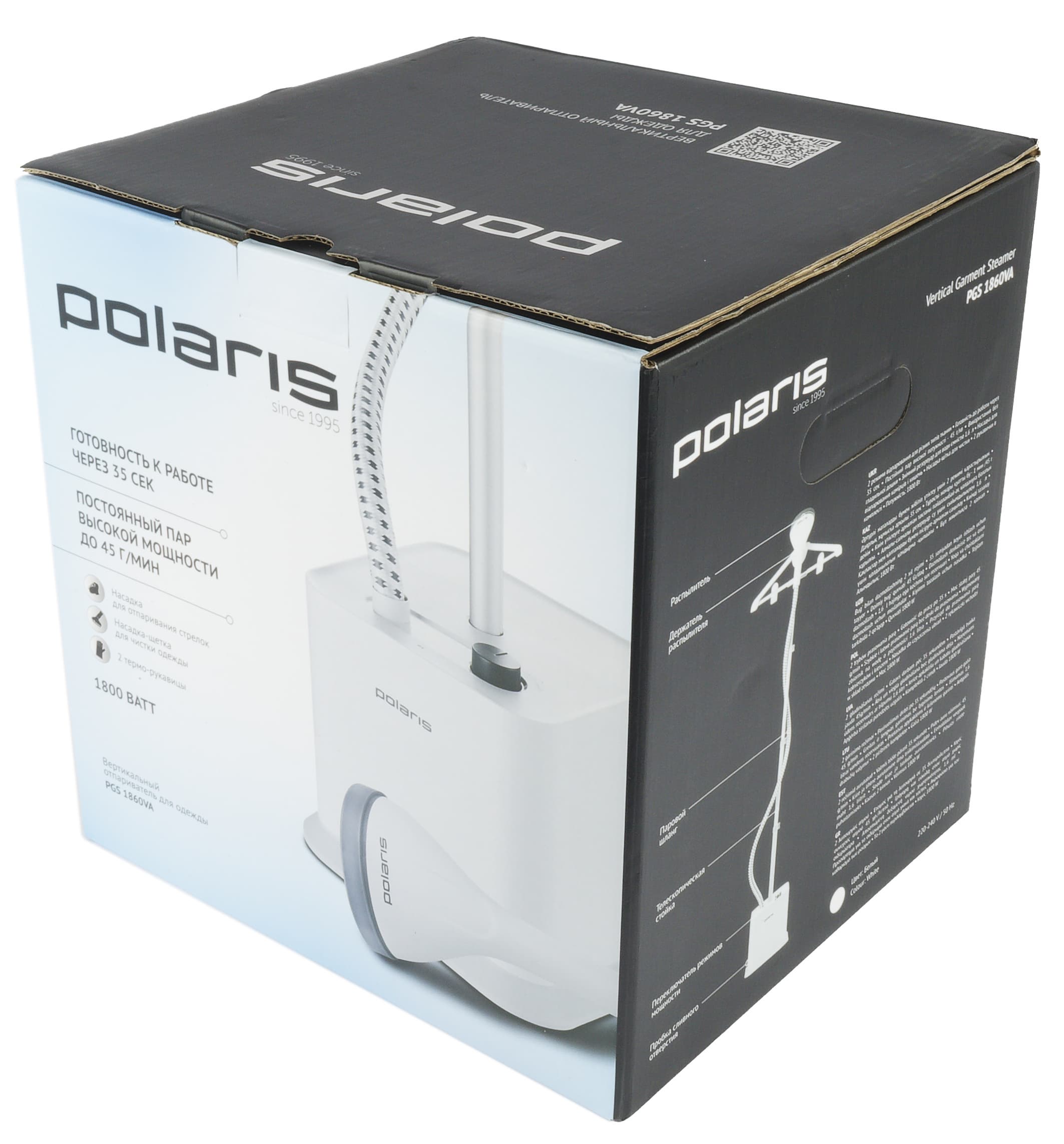 Polaris PGS 1860VA поставляется в большой коробке из прочного картона с матовым покрытием. На бело-голубом градиенте лицевой стороны упаковки размещены: фотография прибора, логотип компании, полное название модели и ее ключевые особенности. На обратной стороне — все то же самое, но на английском. Боковые грани содержат более подробную информацию об устройстве отпаривателя с фотографиями и описанием. На крышке, помимо крупного логотипа Polaris, размещен qr-код, ведущий на страницу модели на официальном сайте компании.