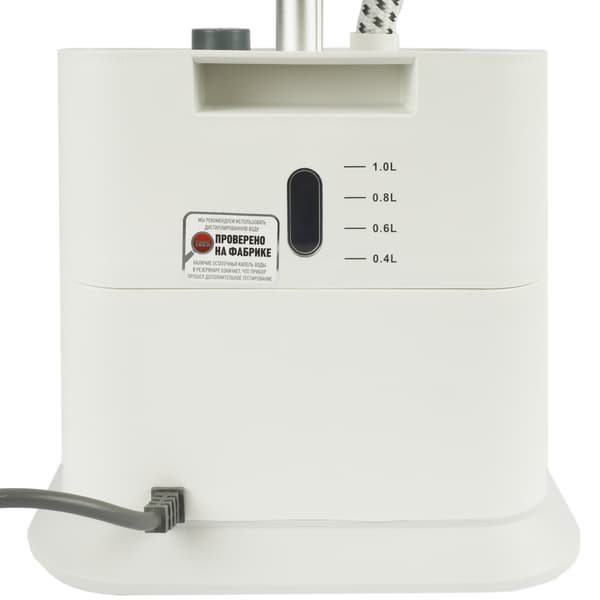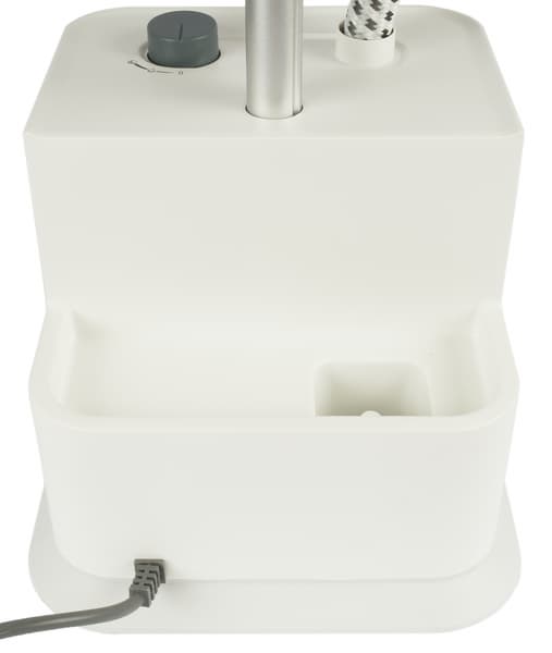 Основой конструкции вертикального отпаривателя является квадратная база с матовым пластиковым покрытием белого цвета.