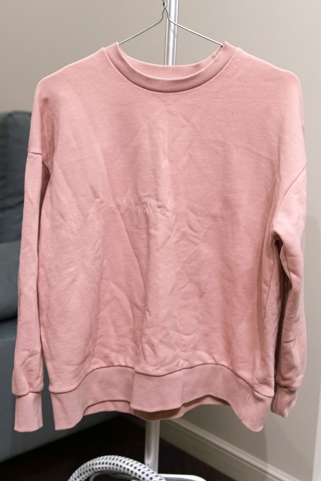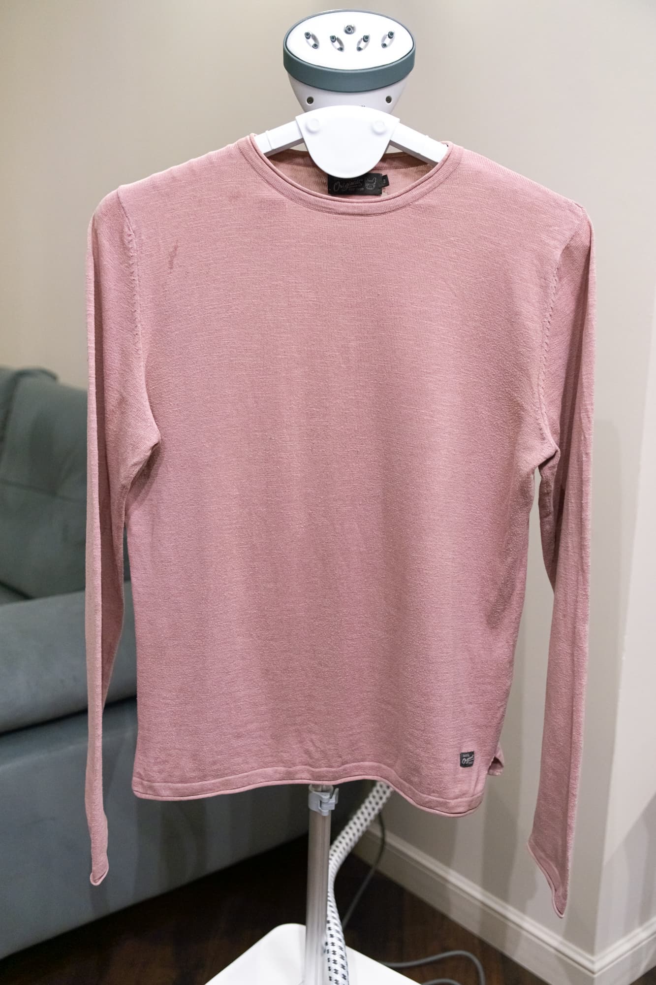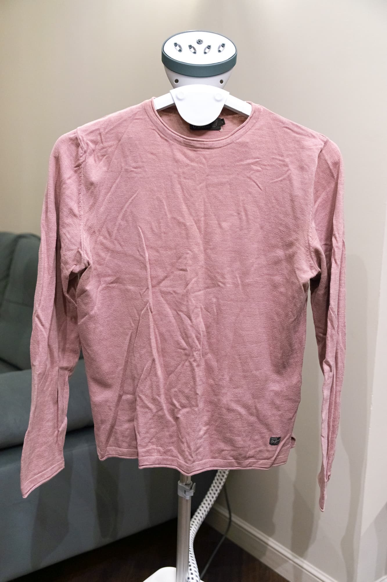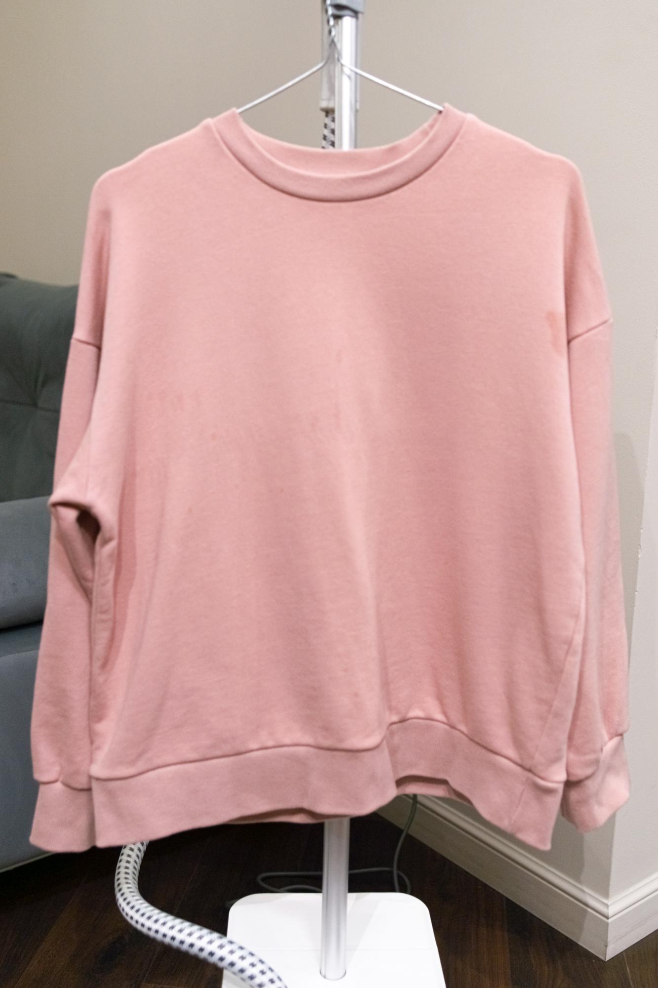 Мощный поток пара легко распрямил замятия на джемпере. Воды на материал попало всего пару капель.