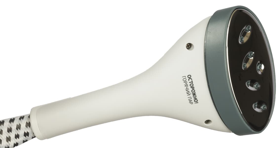 Из верхней части базы выходит паровой шланг в тканевой оплетке. Длина шланга до пластикового распылителя (парового утюжка) составляет 118 см.
